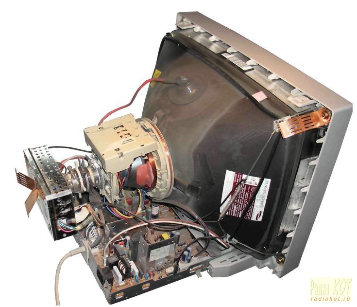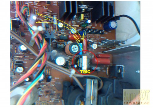 Стоит он обычно около выходного строчного транзистора Довольно часто он собран на Ш-образном железе. Он то нам и надо. Только вот у него по схеме включения нет отвода от середины. Нужно выбрать для ТР1 такой, у которого этот отвод есть, но вывод укорочен и не используется в самом мониторе. Его необходимо подпаять до нормальной длинны. Для ТР2 можно ставить без выведенного отвода (таких большинство).