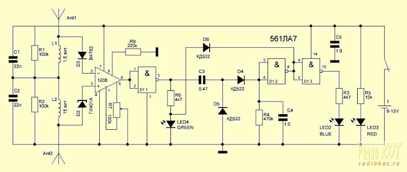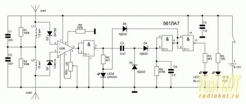 Автор: FAKIR Широкополосный чувствительный индикатор поля с функцией индикации импульсных (цифровых) сигналов. Отличительная особенность данного устройства. 1. Широкая полоса рабочих частот благодаря тому, что индикатор имеет 2 входа, ВЧ и СВЧ. Каждый из входов имеет свою оптимальную индуктивную нагрузку, своё детекторный диод и свою антенну. При суммировании 2ух входов получается сравнительно равномерная чувствительность индикатора в широкой полосе частот. 2. Увеличенная чувствительность индикатора объясняется тем, что используется обращённый тунельный диод на входе ВЧ (основной вход), а в диапазоне СВЧ использован низкобарьерный детекторный диод Шоттки BAT-62. 3. Индикация цифровых сигналов. Эта функция имеет важное информативное значение, так как оператор уже знает, с каким видом излучения имеет дело. КРАТКОЕ ОПИСАНИЕ ПРИНЦИПИАЛЬНОЙ СХЕМЫ. При появлении постоянного электромагнитного поля на выводе №2 компаратора появляется положительный уровень, а на входе №3 - отрицательный. На выводе №6 появляется низкий уровень, а на выходе №3 D1/1 высокий. Загорается светодиод LED4. При появлении цифровых (импульсных) сигналов они детектируются и на выводе №4 микросхемы появится низкий уровень, который через диод D6 блокирует работу светодиода LED4. Таким образом есть индикация или постоянного поля или импульсного светодиодом LED2. Светодиод LED3 - индикатор включения. Если исключить диод D6, то будет одновременная индикация постоянных и импульсных полей. ОСНОВНЫЕ ТЕХНИЧЕСКИЕ ХАРАКТЕРИСТИКИ И ИСПОЛЬЗУЕМЫЕ РАДИОДЕТАЛИ. 1. Диапазон рабочих частот.................................. 50мГц - 5 ГГц. 2. Ток потребления при горящеи индикаторе включения ...1,2 мА. 3. Питание........................ Батарея типа "Крона" либо внешний источник с напряжением 9-12В. 4. R7 - регулятор настройки, возможно совмещение с включателем питания. Данный регулятор может изменять чувствительность ИП. 5. L1 имеет 1,5-2 витка провода диаметром 0,5мм с шагом намотки 1мм. L2 - 12-15 витков провода 0.3мм. Намотка на сверле 2,5мм. 6. Длина антенны - 1 порядка 4-5см. антенна - 2 спиральная, диаметр намотки 3мм с шагом 1,5-2мм и длиной провода 80-100см. НАСТРОЙКА СХЕМЫ. Проверяют напряжение на выводах 2 и 3 компаратора. Эти напряжения практически равны и составляют половину напряжения питания. Регулировочный потенциометр вращают до загорания зелёного светодиода, затем в обратную сторону до его погасания. При дальнейшем вращении чувствительность индикатора уменьшается. Если у вас отсутствует тунельный диод, то можно поступить следующим образом. Точку соединения резисторов R1 и R2 (половина питания) соединяют перемычкой с выводом 3 компаратора. L2 и диод D2 исключают из схемы. Катушка L1 должна содержать 7-8 витков с прогрессивным шагом намотки. Остаётся одна антенна. В таком варианте чувствительность ИП немного уменьшится на низких и на самых высоких частотах.