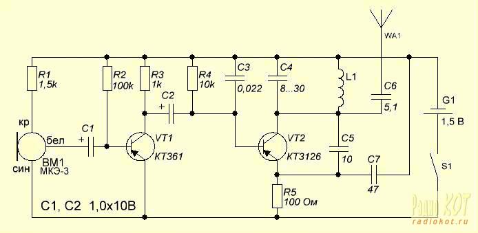 Автор: Андрей-1 Доброго всем времени суток! Предлагаемая схема радиомикрофона рассчитана на работу в диапазоне 88-108 МГц. Дальность действия устройства составляет 10-15м. Сразу скажу, что схема не моя, взята из радиоконструктора. Плата от него давно утеряна, пришлось сделать новую. Основными достоинствами этой схемы считаю следующее: 1.Лёгкая повторяемость даже начинающим радиолюбителем. 2.Небольшое количество деталей. 3.Сигнал, переданный устройством, принимается любым радиоприёмником, имеющим FM диапазон. 4.Довольно хорошее качество звука. 5.Низковольтное питание. 6.Устройство, собранное из исправных деталей начинает работать сразу и почти не нуждается в настройке, но об этом позже. Итак, схема:
