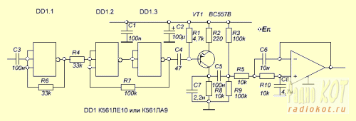 Автор: __ Что делает кот, когда ему заняться нечем? Делалось просто из интереса по принципу, что вот вдруг и немедленно захотелось мне сделать радиостанцию или приемник. Я вывалил на стол то, что у меня есть и стал думать, как из этого сделать то, что хочется вот прямо сейчас, а не дожидаясь неделями, когда придут детали, заказанные через Интернет, т.к. всего вероятнее, что через неделю мне это уже будет неинтересно и мысли мои будут совсем о другом. Само собой приемник работает с АМ модуляцией на частоте 27,135 МГц. Самое интересное, что мне такой приемник был не нужен, т.к. моя цель была сделать не АМ, а ЧМ приемник, но как известно, что параметры приемника в основном зависят от его ВЧ части и примененных фильтров в УПЧ, а в нашей местности никто не работает в диапазоне СВ кроме дальнобойщиков. Мне же нужно было проверить приемник сделанной по подобной структуре. Условия приема дальнобойщиков у меня сложные, поэтому я решил, что если приму их на данный приемник, то переделав его для приема ЧМ, получу приемлемые мне результаты. Статья не предназначена для копирования. Предназначена для тех, кто сам экспериментирует с разными схемами. Понятно, сначала определяем требования к приемнику. Мои требования были в первую очередь, что бы была свобода в выборе кварца. Это можно обойти, если в качестве фильтров в УПЧ применить дефицитные сейчас каркасы, применявшиеся раньше для фильтров ПЧ, но сейчас их уже трудно найти. Да и вообще желательно обойтись без катушек с большим количеством витков и большой добротностью. Перепробовал несколько схем. Добился того, что в приемнике супергетеродине была всего одна катушка с 15-ю витками. Промежуточная частота этих приемников была порядка 40 кГц, поэтому в качестве фильтров в УПЧ можно было поставить полосовые фильтры на ОУ, но про это в другой статье, а здесь только про этот приемник. Выбор преобразователя частоты. Как говорил, их много перепробовал. Вот хотя бы на биполярных транзисторах. Про это написал в статье «CB радиостанция с АМ и минимумом катушек». https://radiokot.ru/forum/viewtopic.php?p=3207498#p3207498 В данном случае взял схему ВЧ части на основе двухзатворного полевого транзистора КП327А. Можно и другой транзистор, вплоть до КП350 или КП306, не говоря уж об импорте. Я взял КП327 только по причине, что у меня он был. Фильтры ПЧ в данном случае выбрал один на основе готового дросселя на 1 мГн. Он является нагрузкой смесителя и полосового фильтра на ОУ. ОУ у меня были только TL072, что определило выбор величины промежуточной частоты. Она не должна быть больше 50 кГц, т.к. на более высоких частотах мой ОУ работал плохо. Если применить более высокочастотные ОУ, то промежуточную частоту можно выбрать больше. Делать ниже 30 кГц, я бы тоже не стал, хотя думаю можно и 25 кГц сделать. Как уже писал, в качестве катушки взял готовый маленький китайский дроссель на 1 миллигенри. Дроссель можно и другой в пределах 300 – 1000 мкГн. Нужно только изменить емкость в контуре. Можно также самому намотать 70 – 100 витков на маленьком ферритовом кольце, а потом подобрать емкость, что бы собственная частота контура была равна промежуточной. Как это сделать, написано здесь. https://radiokot.ru/forum/viewtopic.php?p=2644775#p2644775 Схема ВЧ части получилась такая. VT1 это УВЧ. Что интересно при экспериментах получилось, что чувствительность приемника довольно приемлема, если УВЧ убрать, что я и сделал для