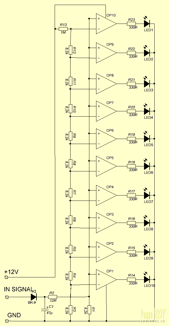 Автор: TERAVOLT, finit222@mail.ru Всем мур-мяу коты и котята!!!Эта статья в основном для новичков,которым нравится музыка со спецэффектами.Я говорю о индикаторе уровня сигнала или правильнее volume unit metre.Прелесть именно этого vu метра в том,что можно использовать буквально любое количество светодиодов (4,8,12,16,20,24...).Принципиальная схема приведена ниже,смотрим и вникаем. Как вы уже поняли,один операционный усилитель отвечает за один светодиод.Исходя из этого я выбрал lm324 у нее в одном корпусе 4 операционника.Таким образом,если у нас 16 светодиодов,берем 4 микры,16 резисторов 330ом,14 резисторов 8,2ком,1 диод 1N4148,12ом-1шт,47мкф на 16в-1шт,1мом-1шт,светодиоды 16шт.На схеме показано как сделать на 10светодиодов,но ее легко переделать хоть под 100 светодиодов,просто продолжаем эту башенку из оперов и резисторов (1 мом должен идти непосредственно к последнему оперу)для того что-бы узнать где какие выводы,нагуглите даташит и потом,при разводке платы уже выбирайте какой опер вам удобнее подключить к тому или иному светодиоду.Все очень просто.Не забываем про питание микрасхемы к ножке 4 идет+ а к 11-.чувствительность столбика будет зависеть от амплитуды входного сигала и напряжения питания 5-12в.Сигнал берем с любого линейного выхода(джек 3,5мм,тюльпаны и т.д). Я собрал и заработало с первого раза.Вот ВИДЕО моего устройства