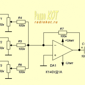 Количество входов устройства легко расширить. Для примера на схеме два входа на 50 и 5 мВ. Для конденсаторного (он же электретный) и динамического микрофонов. Легко добавляйте другие по чувствительности и назначению входы. Например, для звукоснимателя гитары -30 мВ, линейные выходы аудиосистем -250...750 мВ и пр.