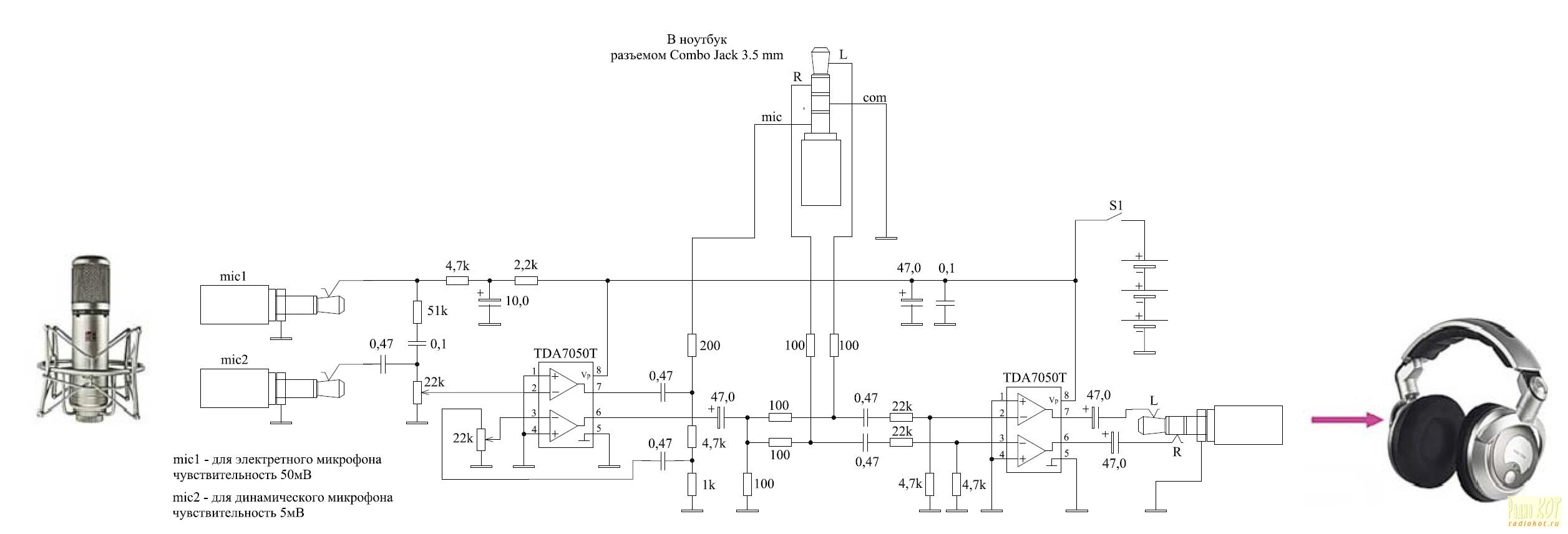 Схема не имеет особенностей. Всё просто и ясно. Недорогие наушники совмещённым микрофоном (гарнитура) использовать не рекомендую, ввиду плохого экранирования микрофонного провода. Питание от батареек (3 шт. ААА) хватает на очень долго.