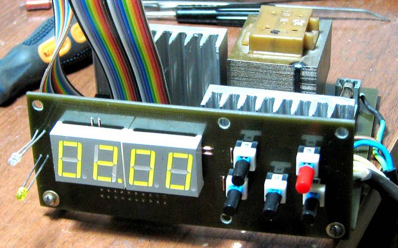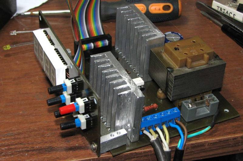 Собственно, все очень просто, ATMega8 или ATMega8L в качестве управляющего элемента, несколько кнопок, четырехразрядный индикатор в динамической индикации и горстка резисторов и транзисторов. В качестве силовых элементов я применил симисторы, включенные через оптосимисторы. Это, конечно вопрос сугубо личный, они у меня были, я их и поставил. Там можно применить и реле, в общем - что есть. Включение оптосимисторов по даташиту, никаких изысков. Единственное, при желании можно исключить RC-цепочку (39 Ом + 0,1мкФ), ее отсутствие не смертельно. Питание схемы тоже максимально простое, транс, диодный мост, электролиты, кренка на 5 вольт. Pullup на кнопки тоже по желанию, ноги порта к плюсу притянуты, на макетке я отлаживал без внешних резисторов. Ну что еще по схеме? Резисторы в базах - плюс-минус какие есть, токоограничивающие по сегментам - в зависимости от индикатора. Кому-то 510 Ом будет ярко, а у меня 150 Ом, так яркости не хватает, индикаторы старые, неяркие. Бузер со встроенным генератором, на 5 вольт. Транзисторы npn на ток порядка 100мА - ВС547, ВС847, КТ3102, КТ315. Питание - трансформатор ТП-112-18, диодный мост на 1А. Вот с симисторами я немножко поволновался - ВТ136 не выдержал пылесоса (1300W), пришлось менять на ВТ140. Для тех котов, кто тоже поставит симисторы и будет использовать пылесос, должен отметить, что радиатор надо ставить побольше, а не то можно обжечь лапы (шутка, лапами к этому радиатору лезть не стоит, с электричеством шутки плохи). Больше 10-ти минутной выдержки мой радиатор не потянет, но поскольку я планирую для этих целей использовать вентилятор, я не сильно переживаю.