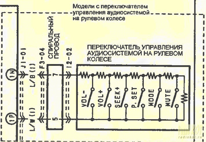 Автор: KoledaS Цель: управлять любым устройством (FM-модулятор, mp3, НЕштатная магнитола, телефон,…) с помощью кнопок на руле авто (при условии, что на устройстве кнопки работают путем соединения контакта с землей, а кнопки на руле используют резистивную схему) Идея заключается в следующем: преобразовать сигнал, идущий по одному проводу от резистивных кнопок, в сигнал на нескольких проводах. На том или другом выходном проводе будет появляться минус в зависимости от нажатой на руле кнопки. На моём авто (Mazda Verisa) схема резистивного управления на руле выглядит так: Если измерить сопротивление между проводами 1P и 1N, то получаем следующие результаты (на разных авто сопротивления могут отличаться, но это не важно, т.к. систему можно обучить любым сигналам):