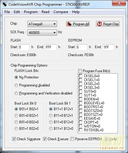 Принцип работы: Изначально систему необходимо обучить, записав в EEPROM определенные АЦП для каждого канала порта D значения соответствующих кнопок. После этого в зависимости от нажатой на руле кнопки АЦП определит значение, найдет такие же значения в EEPROM, и определит каналы порта D, соответствующие найденному значению. После этого на эти каналы будет подан минус (земля). На одну кнопку руля может быть запрограммировано несколько каналов, таким образом при нажатии на эту кнопку минус будет подан на все запрограммированные каналы. Запись прошивки в микроконтроллер ATmega8 Процесс прошивки МК очень прост, всё что для этого нужно это: