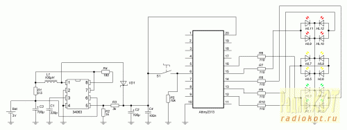 Автор: Ishuinaidu Схема Крайне проста. Основным управляющим элементом был выбран микроконтроллер Attiny2313. Возможно, его ресурсы избыточны для сего изделия, но выбор пал на то, что имелось в наличии. Преобразователь на MC34063 расчитан онлайн калькулятором. Кнопкой S1 происходит переключение режима работы "Нормальный-Аварийный (мигает желтый)". Правда кнопку пока не впаял... Корпус Выбирая корпус игрушки, нашёл в запасах батарейный отсек на 4 элемента АА, что и определило напряжение питания - 3 вольта. Оставшееся место отсека заняла плата с преобразователем 3/5В и контроллером. Считаю, что получилось сносно, для первого раза )))