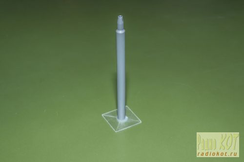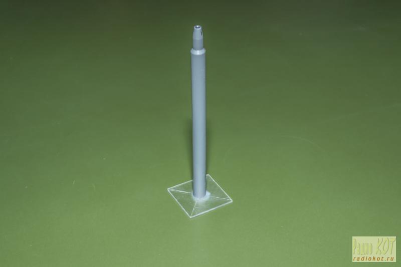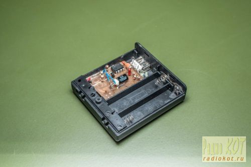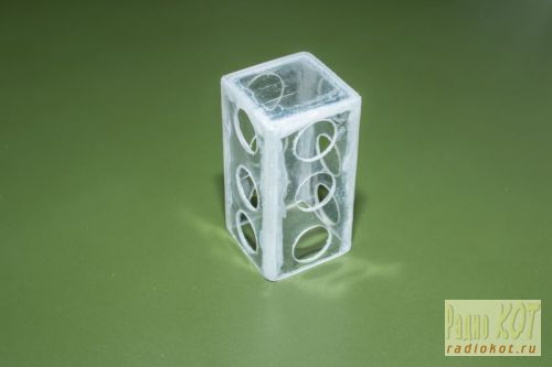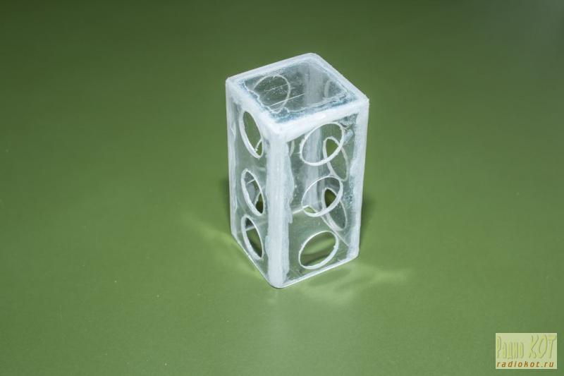 В качестве стойки использовал обычный фломастер. Через эту стойку проводом МГТФ светодиоды соединяются с платой. Светодиоды разместил в самодельной коробочке из оргстекла от CD дисков. Стекло резал нихромом и склеивал дихлорэтаном. Отверстия вырезаны перовым сверлом 14 мм. Самодельные детали покрасил черной краской из баллончика и вот, что получилось: