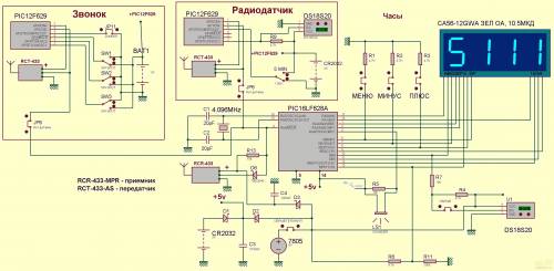 Теперь по радиодатчику температуры (PIC12F629 + DS18S20 + RCT-433-AS + CR2032). PIC12F629 работает от внутреннего генератора 4МГц (+/-2%). Кстати на качество декодирования это не сказывается, т.к. в декодере приемника допустим разброс временных интервалов +/-15%. Модуль питается от литиевого элемента 3В CR2032 (уже больше года). Корпусом служит «яйцо» от больничных бахил. Передатчик отправляет данные о температуре (DS18S20), серийный номер и CRC8 либо каждую секунду, либо троекратно через 5 минут, для переключения в схеме предусмотрен джампер (есть еще одна свободная нога). Остальное время контроллер спит и потребляет ток порядка 0,02 мА (насколько позволил измерить мой китайский мультиметр). Звонок в реальных условиях еще не тестировался. Построен на PIC16F629, питается от одного элемента CR2032. В звонке с помощью джамперов можно выбрать серийный номер и соответственно в часах такая настройка тоже имеется. При нажатии кнопки звонка, три раза подряд в радиоэфир передается последовательность байтов, которую примут часы и включат звук. Если кнопка все еще нажата, то эта последовательность повторяестя. При отпускании кнопки контроллер засыпает. Платы для этих устройств на начальном этапе не разрабатывались. Все было выполнено на односторонних монтажках посредством провода МГТФ. И, как я убедился, работает на ура и без глюков! В последствии эти часы собрал мой друг @SUS, и помог выловить несколько багов. Благодаря его идеям в часы добавилось множество функций.