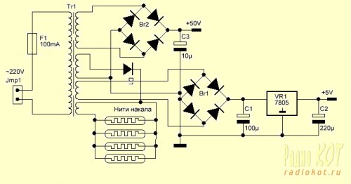 Автор: AtXmega Многих заинтересовала моя идея часов на вакуумно люминесцентных лампах. Сегодня я расскажу как создавались эти часы. ![]() Индикаторы Главную роль, занимают, газоразрядные индикаторы. Я использовал ИВ-6. Это люминисцентный семисегментный индикатор зелёного цвета свечения(На фотографиях вы увидите синеватый оттенок свечения, это искажается цвет при фотографировании, из-за наличия ультрафиолетовых лучей). Индикатор ИВ-6 выполнен в стеклянной колбе с гибкими выводами. Индикация осуществляется через боковую поверхность баллона. Аноды прибора выполнены в виде семи сегментов и десятичной точки. Можно применить индикаторы ИВ-3А, ИВ-6, ИВ-8, ИВ-11, ИВ-12 или даже ИВ-17 с незначительными изменением схемы. В первую очередь, хочется отметить, откуда можно найти лампы, которые выпускались в 1983 году. Митинский рынок. Много и разных. В коробочках и на платах. Простор для выбора есть. Другим городам сложнее, может повезет и Вы найдете в местном радио магазине. Такие индикаторы стоят во многих отечественных калькуляторах. Можно заказать с Ebay, Да Да, Русские индикаторы на аукционе. В среднем 12$ за 6 штук. Управление Управляет всем микроконтроллер AtTiny2313 и часы реального времени DS1307. Часы, при отсутствия напряжения, переходят в режим питания от батарейки CR2032(как на материнской плате ПК). По заявлению производителя, в таком режиме они проработают и не собьются в течении 10 лет. Микроконтроллер работает от внутреннего генератора 8МГц. Не забудьте выставить fuse bit. Установка времени производится одной кнопкой. Долгое удержание, инкриминирование часов, затем инкриминируются минуты. Трудностей с этим нет. Драйверы В качестве ключей на сегменты, я поставил KID65783AP. Это 8 «верхних» ключей. Я сделал выбор в сторону этой микросхемы, только потому, что она у меня была. Эта микросхема, очень часто встречается в платах индикации стиральных машин. Ни что не мешает заменить ее на аналог. Или подтянуть сегменты резисторами 47КОм к +50В, а популярной ULN2003 прижимать к земле. Только не забудте инвертировать выход на сегменты в программе. Индикация сделана динамическая, поэтому на каждый разряд добавлен брутальный транзистор КТ315. Печатная плата Плата выполнена методом ЛУТ. Часы выполнены на двух платах. Чем это обоснованно? Даже не знаю, просто мне так захотелось. Блок питания Изначально трансформатор был на 50Гц. И содержал 4 вторичных обмотки. 1 обмотка — напряжение на сетке. После выпрямителя и конденсатора 50 вольт. Чем оно больше тем ярче будут светится сегменты. Но не более 70 вольт. Ток не менее 20мА 2 обмотка — для смещения потенциала сетки. Примерно 10-15 вольт. Чем меньше оно, тем ярче светятся индикаторы, но так же сильнее начинают светится «не включенные» сегменты. Ток тоже 20мА. 3 обмотка — для питания микроконтроллера. 7-10 вольт. I = 50мА 4 обмотка — Накал. Для четырех ламп ИВ-6 надо задать ток 200мА, это примерно 1.2 вольта. Для других ламп ток накала другой, так что учтите этот момент. В последствии, я заменил трансформатор на импульсный. Рекомендую взять за основу блок питания для галогеновых ламп, на самую малую мощность. Останется только домотать обмотки на нужные напряжения. Возможно, получится так, что для накала 1 витка мало, а 2 много. Тогда мотаем 2 витка и ставим последовательно токоограничивающий резистор на 1-5 Ом Вот такой «электронный трансформатор» с открытой крышко