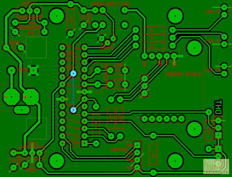 Как видно по схеме, устройство очень простое в повторении. Но на некоторых моментах я всё же остановлюсь т.к. не то, что они сложны, они ВАЖНЫ! Кстати, почти полтора месяца, пока я полностью делал проект, станция выглядела примерно так: Первое на что нужно обратить внимание, это на цепь питания GSM модуля: Почему такая цепь – поясню. Дело в том, что GSM модуль SIM800L штука очень интересная, он полностью совместим по UART с 5 вольтовым МК, т.е. развязки на TX и RX делать никакой не нужно, но при этом он питается от 4- х вольт, как- то так, при 5- ти он горит!!!! Поэтому в цепи ПИТАНИЯ GSM модуля никаких 5 вольт, ВАЖНО!!!! Дело всё в том, что это далеко не первый GSM модуль от SimCom с которым я работаю и входе долгих и мучительных экспериментов выяснилось- он может повиснуть. Случается это крайне редко, но теоретически (практически) может, по крайней мере SIM900 у меня висли, бывало. При чём, виснет он наглухо, я бы сказал, намертво. Он перестаёт реагировать на UART и по сути молчит до тех пор, пока его жестко не передёрнуть по питанию. Скажу честно, SIM800L ещё пока ни разу не вис. Страшного в этом ничего, но было бы обидно, если устройство, заявленное как полное автономное вдруг берёт и зависает. Работает это по следующему алгоритму. После подачи питания на МК, МК включает реле через полевой транзистор, но при этом постоянно отслеживает UART, если от модуля в течении 30 секунд не будет получено информации, проще выражаясь, если GSM модуль «молчит» в течении 30 секунд- значит он висит. Далее, МК отключает реле и начинает всё заново. Т.е. включение- первичная инициализация – переход в рабочий режим. Можно сказать- это тоже самое, как если бы в случае повисания, вы передёрнули бы питание всего девайса. Не забудьте впаять перемычку в виде кусочка провода или откусанной лапки от, например, резюка под панелькой МК!!!!