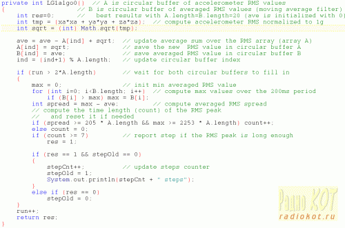 Помимо этого оборудования на семинарах нам была представлена разработанная лекторами система с графическим интерфейсом для обработки данных сенсоров. Система написана на языке Java и пока не имеет названия, находится в стадии разработки, и недоступна для загрузки с сайта фирмы. Однако, уже сейчас она позволяет дополнить себя алгоритмами пользователя. На трёх верхних графиках скриншота ниже показаны данные с трёх осей акселерометра на этой плате, носимой на поясе, а нижний график соответствует длине вектора ускорения А. Вертикальные розовые полосы в данном случае соответствуют результатам обработки шагов «нашим» алгоритмом. Полоса управляется переменной res в алгоритме пользователя и появляется в результате обнаружения шага при res=1. Как следует из графика, алгоритм успешно распознал все 21 сделанных шагов. А вот, собственно, и наша Java-реализация упомянутого выше алгоритма. Акселерометр работает в режиме 2048 отсчётов на 1g (полная шкала ±4g). В массиве А хранятся последние 20 значений величины sqrt, а массив B нужен для хранения скользящих средних и вычисления их максимума за последние 20 отсчётов. Алгоритм адаптирован под использование целочисленных вычислений с прицелом на реализацию на МК. В частности, вместо нормированных к 1g ускорений xa, ya, za используются сырые данные акселерометра, а для исключения операции деления вместо средних значений в переменной avg и массиве B хранятся суммы элементов в массиве А. Переменная run нужна для индикации заполнения массивов данными в начале работы алгоритма. Наилучшего результата удалось добиться модифицировав определение величины spread в оригинальном описании. Именно, вместо разности между скользящими максимальным и минимальным значениями длины вектора А за период 200 мс (A.length * 10 мс) нами использована разность между максимальным и текущем средним значением. Для регистрации шага эта разница должна быть на протяжении 70 мс не менее 0.1g при максимумe за период не менее 1.1g. Все эти константы подобраны экспериментально с учётом рекомендаций в [8,9]. При портировании этого алгоритма на 16-битный МК он подвергся некоторой коррекции. Именно, из 14 бит данных акселерометра по каждой оси для простоты реализации использовались лишь 8 старших. Это привело к замене констант 205 и 2253 в if-условии на 8 и 35, соответственно. Все переменные в алгоритме 8-битные за исключением avg, max и буфера B, которые 16-битные. Переменная run обнуляется каждый раз после выхода системы из дежурного режима и её максимальное значение программно ограничено на уровне 255 с целью предотвращения обнуления при инкрементации. Целочисленный квадратный корень вычисляется по алгоритму представленному в секции Binary numeral system (base 2) статьи [10] из Википедии. Несмотря на такую адаптацию и простоту, алгоритм обеспечивает достаточно надёжное распознавание шагов в нашей конструкции при креплении педометра на ремне брюк во время ходьбы (другие способы крепления не испытывались). Исходный код программы микроконтроллера для системы IAR и файл платы для Eagle прилагаются. Литература
