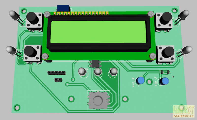 Длинное (более 0,6 сек) нажатие кнопки канала - пуск/останов счёта канала, а также выключение сигнализации канала. Пуск счёта возможен прямо из режима установки времени, а останов - только из основного режима. Включение счёта канала зажигает светодиод канала; на индикаторе возле времени считающего канала отображается треугольник с анимированным заполнением: По окончании счёта звучит звук сигнализации; на индикаторе возле времени канала, счёт в котором закончился, появляется символ колокольчика; светодиод канала, в котором окончен счёт, начинает часто мигать: Конструкция. Конструктивное исполнение устройства может быть любым - например, часть деталей (кнопки, энкодер, светодиоды) можно закрепить на передней панели корпуса, а от них пустить шлейф проводов к плате. Можно все компоненты разместить на плате, однако в этом случае потребуются длинные толкатели для кнопок. В авторском варианте конструкции использовались кнопки с подсветкой, закреплённые на передней панели корпуса. Возможно использование обычных кнопок; тогда светодиоды каналов следует расположить возле этих кнопок. Дисплей соединяется с основной платой посредством штыревых соединений: штыревая планка запаивается на контакты индикатора, а на плату устанавливается ответная часть ("мама"). Высота стоек - 12 мм. Устройство изначально планировалось в варианте без светодиодов каналов, с 8-битным протоколом связи контроллера с LCD, а также с более сложным УЗЧ, на MC34119. Вот так выглядел прототип: Впоследствии было решено добавить светодиоды каналов (кнопки с подсветкой), а от сложного УЗЧ отказаться, ограничившись простейшим двухтактным каскадом, т.к. громкость звука и в этом случае оказалась вполне достаточной (в качестве динамической головки использовался распространённый миниатюрный динамик диаметром 25 мм - такой очень часто применяется в различных китайских игрушках). Именно такой - улучшенный - вариант схемы, платы и прошивки предлагается в прилагаемом архиве. Рисунки плат даны во вложении, уже в зеркальном виде (ещё раз зеркалить - не нужно!), с разрешением 600 dpi. На плате имеются две перемычки типоразмера 1206, на схеме не указанные. Примерный 3D-вид платы таков (у автора в наличии были не все модели, поэтому вид слегка корявый): При разработке устройства использовалась САПР DipTrace. Плата делалась методом ЛУТ с использованием дающей отличный результат термомтрансферной бумаги для лазерного принтера для переноса на твёрдую поверхность. Двухстороннее нанесение рисунка на плату делается так: 1) печатаются (на указанной бумаге) две стороны рисунка; 2) стороны совмещаются на просвет (лучше не в дневном свете, а возле мощной лампы); 3) совмещённый стороны закрепляются степлером на полях так, чтобы можно было в полученный "бутерброд" засунуть плату; 4) Засовываем плату в "бутерброд", проверяем по краям, что рисунок не выходит за границы текстолита; 5) Утюжим сначала одну сторону, затем другую, попеременно. Прогрев должен был плавным, чтобы минимизировать эффект неравномерной деформации бумаги. Никаких реперных отверстий сверлить не нужно. Описанный метод даёт отличную точность совмещения, и это при такой простой технологии. Сверление отверстий производится, разумеется, после травления. Корпус в авторском варианте - готовый пластиковый, покрашенный аэрозольной краской, а поверх нане