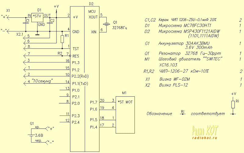 Традиционные циферблатные часы собраны с использованием шагового двигателя X16.103 от SWITEC и микроконтроллера MSP430F1121A. Для повышения продолжительности работы от элемента питания микроконтроллер находится в спящем режиме, кратковременно включаясь для обработки прерываний и движения стрелки. Шаговый двигатель X16.103 специально предназначен для создания часов в автомобильной технике. Приведение в действие часов осуществляет 16-разрядный микроконтроллер MSP430F1121A семейства MSP430 от Texas Instruments, которое отличаются чрезвычайно низким потреблением, имеет очень удобную систему команд (всего 51 команда, из которых 27 базовых), широкие возможности независимого выбора тактирования ядра и периферийных модулей. К сожалению, в любительской среде семейство MSP430 применяется слабо, а жаль. К контроллеру подключен "часовой" кварцевый резонатор частотой 32768 Гц, шаговый двигатель и кнопка "+". Питание часов осуществляется от одного элемента напряжением 3.6 В, которые потребляют в среднем 5 мкА. Частота 32768 Гц с внутреннего генератора поступает на вход 16-разрядного таймера, который каждые 2 секунды переполняется, изменяя состояние регистрового счетчика на 4. Последние 2 секунды 10-секундного интервала разбиты на два этапа. После первого интервала, длительностью 1,95 секунды вызывается движение стрелки на один шаг, длительностью 50мсек. Для коррекции положения стрелки служит кнопка "+". Так как время формирования 10-секундного интервала выбрано заведомо большим ( т.е. формируется интервал 10"000"000+20 мксек) и часы всегда отстают, можно управлять ими только одной кнопкой. В представленной ниже "прошивке" кнопочное управление не поддерживается.