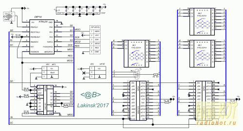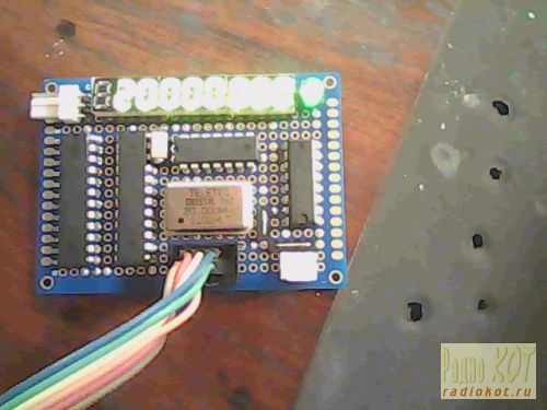Автор: antobel С детства люблю частотомеры... Первый собрал ещё в 6-м классе на древней 155й серии (SN74Classic TTL) и вакуумных индикаторах... Затем попадались разные вариации в литературе - и многие не совсем уж дикие собирал просто так - посмотреть что получится... Последний сваял сам двое суток назад, и сутки писал софт... В ключе "борьбы с депрессией". Сначала хотел воткнуть 48мегу, а потом разобрал азарт - а что помельче можно воткнуть? В закромах нашлась 24 тинька с буквой "А". В результате получился сугубо однорежитмный зверёк - время измерения - 1 секунда, диапазон - в теории 125мгц, на практике проверял до 80мгц. входной щуп - на усмотрение, схем полно, у меня основной целью была отбраковка кварцев из крупных партий, так что я вывел питание землю и вход - чтобы иметь возможность разные генераторные приблуды попробовать... Итак - схема: Сваяно было на макетке размером 5*7см посредствоом старого доброго МГТФ-0.03, с целью присобачить к стенке над рабочим столом, поэтому разъём питания - угловой в сторону основного БП, а входной - снизу. На фото (за качество извиняюсь) запитано от программатора, а измеряет собственную тактовую :) RGB-светодиод отображает режимы - во время 1й экспозиции по включению он красный, а последующие он то зелёный то синий. Незначащие нули программно гасятся, частота отображается в герцах. Компоненты: ATtiny24A - Фьюсы процессора настраиваются просто - внешняя частота с максимальной задержкой, 2,7в детектор питания и естественно удалить делитель на 8. Замена 74AC161 на более медленные серии повлияет на верхнюю границу диапазона, но не повлияет на общую работоспособность. По мере убывания частоты: ACT,F,ALS,LS,HC. S применять не рекомендую из-за сильной генерации помех по питанию. MAX7219 ессно контрафактный китайский с ебея. 50 шт купил по цене 1,5 фирменных. Индикаторы - какие попались, главное чтобы были с общим катодом. вот светик оказался ОА - в результате управляется как три знака "-". Эти - FYT-2531A - понравились размерами :) Осциллятор 20МГц - с дохлой матплаты начала 90-Х... Кто захочет повторить - Удачи!