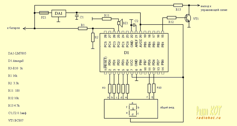 Фузы никакие программировать не нужно, все стоит на заводских. Если уж захочется что бы пикало быстрее-можно поставить тактовую частоту в 2мгц или 4,это уже на ваше усмотрение. Фотки устройства: Видео работы https://www.youtube.com/watch?v=b6FNs-dnu98&feature=feedu https://www.youtube.com/watch?v=B3Jpp2sisRE&feature=feedu Cхема для симисегментного индикатора с общим анодом. При нормальном напряжении аккумулятора на выходе схемы лог 1, при разрядке 0. Реализован гестерезис. Светодиоды заменены идикатором на котором отображаются цифры 8-1 соответствующие уровню заряда Думаю статья поможет тем кто не хочет городить неделями транзистор к транзистору, и подпирать резистором)) А главное микроконтроллер дешевле LM3915!!! (Правда, помимо МК вам понадобится еще программатор и компьютер, чтобы запрограммировать контроллер, но автор почему-то не включает это в стоимость. Прим. Кота.)