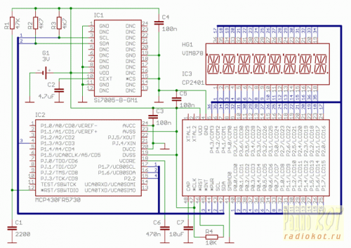 Автор: Сергей Безруков (aka Ser60) В радиолюбительской литературе уже неоднократно публиковались конструкции, используюшие цифровые сенсоры температуры и влажности. Такие сенсоры обеспечивают высокую точность измерений и не требуют калибровки. Большинство таких конструкций основано на сенсорах фирмы Sensirion SHT-21, присутствующих на рынке с 2010, или их более старых, но более дорогих, предшественниках SHT-15. Сенсоры эти работают замечательно, однако стоят недешево. Я уже рассказывал об их альтернативе HIH-6130 фирмы Honeywell, появившихся весной 2012, которые почти в 2 раза дешевле (https://radiokot.ru/circuit/digital/home/135/). Однако, у них более узкий температурный диапазон работы (-25 - 85°С против -40 – 125°С), зато более широкий диапазон напряжения питания (2.3 – 5.5В против 2.1 – 3.6В). В конце октября 2012 фирма Silicon Laboratories внесла свой вклад в эту тему, выпустив сенсор Si7005 с I2C интерфейсом, цена которого составляет почти треть от таковой для SHT-21. О нем и пойдет речь в этой статье. Диапазон питания сенсоров 2.1 – 3.6В и они выпускаются в двух модификациях: для положительных температур (0 - 70°С, с суффиксом FM в идентификаторе ) и промышленного диапазона температур (-40 - +85°С, с суффиксом GM). Более того, обе разновидности выпускаются с установленным фильтром на корпусе (модели с суффиксами FM1 и GM1) и без него. Этот фильтр предохраняет сенсор от пыли и конденсации влаги на чувствительном элементе при работе сенсора в экстремальных условиях. Цена сенсоров немного различается в зависимости от указанных опций. Вот как выглядят эти сенсоры с фильтром и без него. Особенностью сенсора является встроенный подогреватель, который помогает избавиться от конденсации влаги на измерительном конденсаторе, влияющей на точность показаний. Подогреватель способен повысить температуру внутреннего пространства сенсора на 5°С по сравнению с температурой окружающей среды. Другой особенностью является отсутствие режима сна с низким токопотреблением. Для достижения последнего рекомендуется коммутировать питание сенсора с вывода управляющего МК – в режиме измерения сенсор потребляет около 240 - 320 мкА и ему нужно всего около 10 мсек для выхода на рабочий режим после подачи питания. Столько-же времени нужно для активизации сенсора через вывод CS. Я так и не понял зачем он вообще нужен, и на тестовой плате я его просто заземлил. Для тестирования использовалась следующая схема. Обработка данных сенсора температуры достаточна простая и особенностей не имеет. Однако, обработка показаний влажности требует больше вычислений по сравнению с SHT-21 или HIH-6130 и напоминает таковую для сенсора SHT-15. Именно, сначала следует считать «сырые» показания влажности RH из сенсора, затем линеаризовать их, используя формулу (см. ДШ) RHlin = RH + 0.00393·RH2 – 0.4008·RH + 4.7844, и в заключении произвести термо-компенсацию показаний по формуле RHt = RHlin + (T – 30)×(RHlin·0.00237 + 0.1973), где T – температура окружающей среды. Как показывают графики ниже, линеаризацию и термо-компенсацию имеет смысл производить, т.к. иначе показания сенсора будут завышенными. Красной линией показаны «сырые» показания сенсора, зеленой – линеаризованные, а синей – линеаризованные и термо-компенсированные при температуре 20°С. Для исключения работы с дробными числами, можно умножить обе части формулы для RHlin на 105. После преобразований получим RHlin·105 = RH·(59920 - RH·393) + 478440, RHt·105 = (RHlin·105) + (T – 30)·((RH