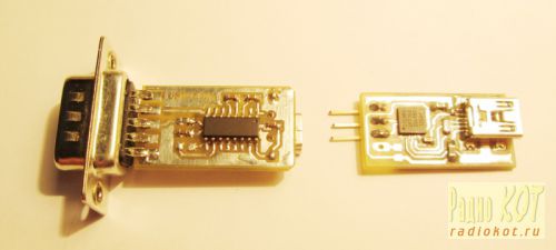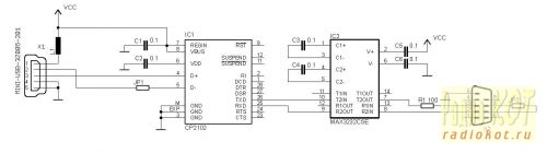 Следующим этапом стало изготовление переходника USB-RS232. На это меня сподвигли танцы с бубном вокруг моего рабочего компьютера, когда я пытался подключить к штатному СОМ порту контроллер Omron. На это было убито пол дня, измучена техподдержка Омрона, но в итоге выяснилось что это именно мой COM порт не хочет работать конкретно с Омроном. На другом компьютере контроллер подключился моментально, но на следующий день пришел хозяин компьютера и меня выгнал. Нашел у людей переходник USB-COM, но каждый день побираться не удобно, по этому появилось следующее изделие. Преобразователь USB-RS232 Была куплена та же микросхема CP2102 и MAX202. Ее отличие от типовой MAX232 в том, что в обвязке требуются меньшие конденсаторы по 0,1мкФ, а также она продавалась в узком корпусе, что для меня было удобнее. Дроссель имеет ту же функцию что и в предыдущей конструкции, резистор R1 на всякий случай - не люблю я подключать выходы на прямую на случай КЗ. Сборка заняла один вечер, при подключении все заработало сразу. Фото того что получилось ниже (качество поганое, как и фотоаппарат) :