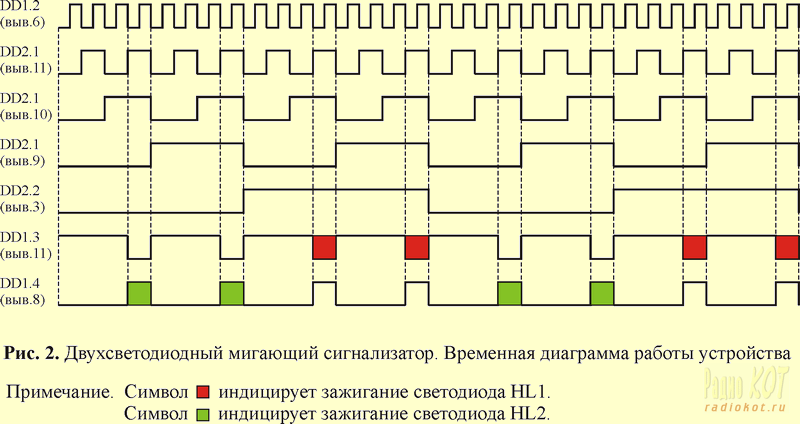 Это означает, что время свечения светодиода составляет 25% периода вспышки, что субъективно соответствует наиболее четкому вспыхиванию светодиодов. Кроме того, такая скважность в два раза продлевает срок службы маломощных элементов при батарейном питании устройства. Будем рассматривать работу устройства, считая, что в начальный момент времени счетчики DD2.1 и DD2.2 находятся в «нулевом» состоянии. На элементах DD1.1, DD1.2 выполнен генератор прямоугольных импульсов, с частотой следования около 10 Гц. При переключении элемента DD1.2 в противоположное состояние, напряжение на левой, по схеме, обкладке конденсатора С1, суммируется с предыдущим значением и достигает практически удвоенного значения напряжения источника питания. Для входных защитных диодов элемента DD1.1 такой режим работы недопустим, поэтому в устройство введен резистор R1, ограничивающий импульсы тока на уровне 1 мА, что уже является вполне приемлемым значением. Этот резистор предотвращает выход из строя защитных диодов и, тем самым, значительно повышает надежность устройства при длительной эксплуатации. Счетчик DD2.1 срабатывает по отрицательным перепадам счетных импульсов, и, при достижении «третьего» состояния, формирует на выходах «1» и «2» (выводы 11 и 10, соответственно) уровни логических единиц, которые, поступая на входы элемента DD1.3, вызывают появление на его выходе уровня «нуля». Этот логический уровень поступает на вход элемента DD1.4 и, инвертируясь последним, вызывает зажигание светодиода HL2. Происходит это благодаря тому, что счетчик DD2.2, как отмечено выше, находится в исходном «нулевом» состоянии, а на выходе элемента DD1.4 формируется уровень логической «единицы» (см. временную диаграмму на рис. 2).