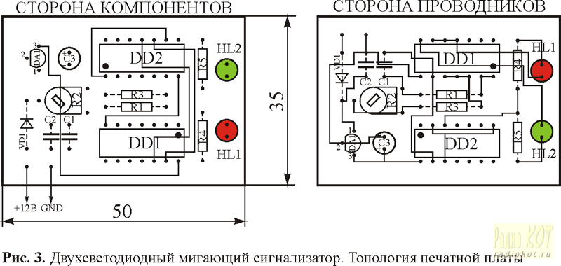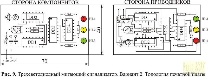 и пятый вариант: (рис. 14): 50x90 мм. В устройствах применены постоянные резисторы типа МЛТ-0,125, подстроечные СП3-38б в горизонтальном исполнении, конденсаторы неполярные типа К10-17, оксидные — К50-35 или импортные. Микросхемы КМОП-серии КР1554 обладают высокой нагрузочной способностью (до 24 мА), что позволяет подключать светодиоды к их выходам непосредственно, без ключевых транзисторов. Если сверхъярких светодиодов в распоряжении не окажется, можно использовать и светодиоды стандартной яркости, но, в таком случае, необходимо использовать только ИМС серии КР1554, выходные токи которых могут достигать 24 мА. В схемах генераторов прямоугольных импульсов на месте КР1564ЛА3 (74HC00N) можно использовать также КР1564ТЛ3 (74HC132N), содержащую в своем составе четыре триггера Шмитта. Этот вариант наиболее предпочтителен при батарейном питании устройств, для повышения их экономичности за счет существенного уменьшения сквозных токов при переключении логических элементов. Благодаря высокой нагрузочной способности КМОП-микросхем серий КР1564 и КР1554, возможно сочетание в одном устройстве микросхем КМОП (КР1564, КР1554, КР1594) и ТТЛШ (КР1533, К555) и даже ТТЛ (К155) серий. Неприменимы в устройствах только микросхемы серий К561 и КР1561, нагрузочная способность которых не превышает 1 мА, даже для приборов серий CD40xxBN. К примеру, на месте DD1 (КР1564ЛА3) может работать ее полнофункциональный ТТЛШ-аналог типа КР1533ЛА3. Поскольку входные токи микросхем ТТЛШ-серий значительно больше соответствующих значений для КМОП-микросхем, необходимо установить подстроечный резистор (R2) сопротивлением 1 кОм, а постоянные (R1 и R3) заменить перемычками. При этом неполярный конденсатор С1 заменяется оксидным ёмкостью до 100 мкФ, чтобы сохранить постоянную времени генератора. При питании устройств от маломощных элементов общим напряжением 3 В, интегральный стабилизатор и защитный диод необходимо исключить, а светодиоды подобрать с минимально возможным рабочим напряжением свечения. При использовании на месте генератора микросхемы КР1564ТЛ3 (74HC132N), ресурса элементов питания будет достаточно для нескольких месяцев непрерывной работы. Устройства, собранные из исправных деталей и без ошибок в налаживании не нуждаются и работают сразу при включении. Литература. 1. А. Одинец. «Мигающие светодиодные сигнализаторы.» — «Радио», №3, 2006 г. 2. А. Одинец. «Мигающие светодиодные сигнализаторы.» — «Радиомир», №9, 2007 г., с.18-21, №10, 2007 г., с.17-20.
