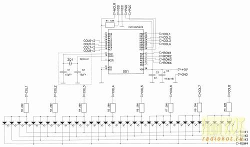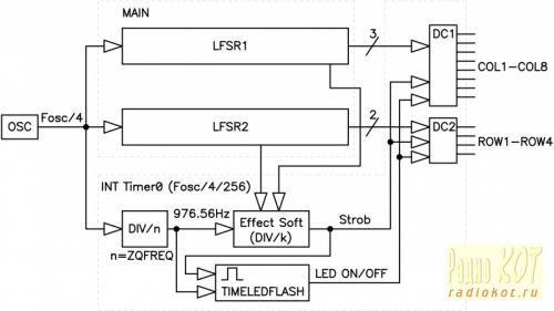 А дело было так… 30-го декабря подарили на работе искусственную ёлку высотой ~35 см (без игрушек). Покупать китайские гирлянды или игрушки не было ни времени, ни желания. Сразу отвечу на вопрос ‘Почему был выбран PIC18F25K22?’. Просто за день до Нового Года это единственное, что у меня оказалось под рукой. Если у Вашего контроллера нет ‘Internal Oscillator’ – придётся поставить два конденсатора и кварц (на схеме обозначено 'Optional') и указать в тексте программы частоту кварца (параметр ZQFREQ). Если потребуется – поставьте драйверы светодиодов (из расчёта, что в любой момент времени может быть включен только один светодиод). Блок питания +5V на схеме отсутствует, так как проще всего использовать обычное (USB) зарядное устройство для мобильного телефона или, на свой страх и риск, USB-порт. Конечно же, число резисторов можно сократить до 4-ёх, перенеся их с линий COLx на ROWx. Основа эффекта – счётчик с переменным коэффициентом деления и два генератора псевдослучайной последовательности (ГПСП), реализованные на основе линейного регистра сдвига с обратной связью (Linear Feedback Shift Register (LFSR)). Длина первого – 23 бита с отводами от 4-го и 22-го выхода, второго – 28 бит с отводами от 2-го и 27-го выхода. С одного из них 'защёлкиваются' данные для COLx (3 бита) с другого – ROWx (2 бита). Так же, 'перекрёстно', с них 'защёлкиваются' данные для изменения времён эффекта (если значения параметров TIMEHOLD_H и (или) TIMEHOLD_L равны '0').