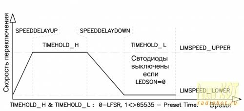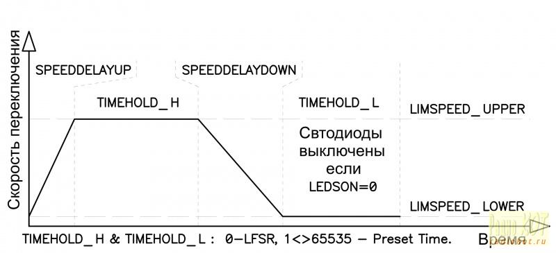 Если попробовать перевести алгоритм программы в 'железо' – условно его можно представить так: ZQFREQ и TIMELEDFLASH – названия параметров в 'шапке' программы. На графике указаны названия параметров в 'шапке' программы: Видео эффекта* + Аркадий Хоралов и Новые Самоцветы "Новогодние Игрушки" *Поскольку время 'вспышки' светодиодов ~8.2 ms (параметр TIMELEDFLASH=8) и минимальное время между 'вспышками' ~10.24 ms (параметр LIMSPEED_UPPER=10), видеокамера не может передать этот эффект 'как есть'. В оформлении ёлки использованы SMD светодиоды: