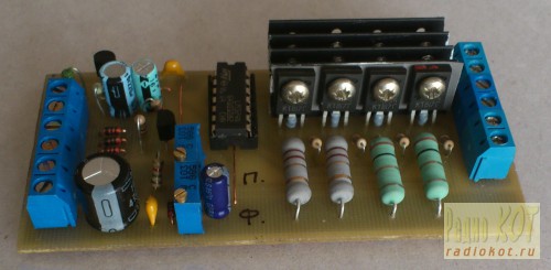 Автор: Alika Знакома ли вам ситуация: перегорают светодиодные лампы в автомобиле? Бывает время от времени, ну и какой выход? - Правильно установить защиту, то есть специализированный драйвер. Но хотелось бы попроще и подешевле ? -Не вопрос! Сделаем! Ниже представлена схема готового 4х канального драйвера. В каждый канал можно включать до 3 светодиодов последовательно. То есть от 4 до 12 светодиодов. Схема не требовательна к элементам. Главное что бы был запас по мощности элементов. Схема состоит из следующих узлов: 1-Модуля запуска (в упрощенной плате отсутствует) на элементах R1, R3, C2, C2, T1. 2-Модуля переключения в режим подсветки (вроде как ближний свет для фар) - можно тоже выкинуть если не надо - элементы D1, D2, D3, R5, R6, R2, T2. 3-Модуля задания тока R7, C3, D4, R4, 4-Выходных каскадов на транзисторах, резисторах и операционном усилителе. Модуль № 1 (Модуль запуска) служит для развязки линий питания от линий запуска - в простой схеме отсутствует. Модуль № 2 Переключения служит для изменения опорного напряжения в линиях компаратора - то есть выходного тока. Модуль № 3 Задает максимальный выходной ток. При заданных элементах D4 - как стабилитрон 0.7V и резисторах R8, R9, R10, R11 по 1ом 2W - максимальный выходной ток составляет 0.7А. Если нужен ток побольше, то вместо диода можно установить стабилитрон или уменьшить сопротивление резисторов. Пример - диод и резисторы по 0.1 ом - ток до 7А. Светодиод и резисторы по 1Ом - ток до 2А. Диод и резисторы по 10 Ом - 0.07А. Модуль № 4 Выходной каскад. Вообще для схемы теоретически подойдет любой операционник, да и транзисторы тоже любые(КТ 817 - дешево и сердито). Главное чтоб по току запас был. Настройка: Подать питание на плату. Подать питание на модуль запуска (если он есть). Установить на выводе № 3(или 5, 10, 12) напряжение ну скажем 0.1В. При заданных элементах это составит 0.1А. Подать питание на модуль переключения - на любой вход. Установить на выводе № 3 пусть 0.05В (0.05А). Подключить нагрузку(Фару светодиодную). Выставить необходимый ток - для 3 ватовых светодиодов вроде как 0.33А (0.33В смотрите документацию на светодиод, хотя там вроде как бы 0.35А). Включить подсветку и выставить как больше нравиться. Готово. Схема проверена. при напряжении в линии 12В и падении напряжения на светодиодах по 3В - больше 3 штук последовательно не включать. А то работать не будет. При других напряжениях максимальное количество подключенных светодиодов считайте сами. Схема может работать при максимальном напряжении до 30В. Конденсаторы в схеме практически любые - главное чтобы проходили по напряжению питания.