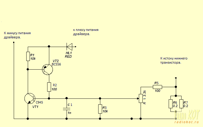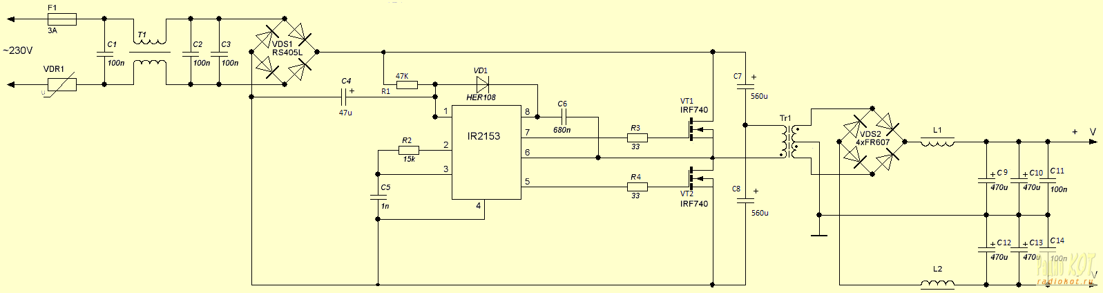 Автор: TDA2051, razmik.titoyan@list.ru Всем привет дорогие коты и кошки!С вашего позволения начну я с предисловия.Попросил меня мой хороший друг собрать БП на +-30В и 350Вт(Похоже для TDA7293,в размере двух штук,любит он брать все с солидным запасом).Баночка сайры и два литра молока заставили меня зайти в интернет и начать искать схему.Сначала хотел собрать на всеми любимой TL494,но когда увидел,что на обвязку нужно немало деталей,да и ТГР(трансформатор гальванической развязки) мотать сразу отбросил этот вариант на будущее.Дальше на растерзание пошла UC3825.Деталей в обвязке конечно меньше,но опять же нужно мотать ТГР и еще ТТ(трансформатор тока).С ними возиться я не хотел,да и подходящих трансформаторов у меня не было.Тут вспомнилась такая штукенция,как IR2153.Для тех кто не знает-это высоковольтный драйвер для полевых транзисторов.Максимальный выходной ток-0.21А.Мало,но для IRF740 хватит.Но есть одна проблема-в микросхеме нету усилителя ошибки,то есть защиту с помощью самой микросхемы не организовать.Благо человечество придумало тригерную защиту.2 транзистора, 4 резистора, 1 конденсатор и защита готова.Собственно предисловие закончилось.Теперь прошу взглянуть на две схемы-блока питания и защиты. Как видите,схема блока питания не сильно сложная,но пару моментов стоит отметить.Первый-это частота преобразования.Тут вся шляпа в том,что выше 60кГц уже не поставить.Почему?Потому что номинал затворного резистора придется уменьшать при повышении частоты,чтобы затворный конденсатор быстрее разряжался,а IR-ка не сможет полноценно раскачивать полевики с 10-и омными резисторами(это если частота выше 60кГц).Поэтому я рекомендую ставить частоту не более 57кГц.Я тут кстати в схеме забыл поставить кондер,между средней точкой кондеров и трансформатра.ОН ОБЯЗАТЕЛЕН!!Без него будет сильный перекос напряжения на кондерах,и может произойти БУМ! Второй момент-бустрепный конденсатор.А тут шляпа в том,что микросхема открывает верхний транзистор исскуственно(в этом участвуют конденсатор и диод).Для этого нужен конденсатор,чтобы правильно окрывать и закрывать верхний ключ,а через диод кондер разряжается.Скажете:И ШО С ЭТОГО?А то,что номинал этого кондера зависит от частоты.В моем случае,блок нормально завеля с емкостью в 1 мкф,в вашем случае она может быть другой,а об этом я уже буду глаголить,когда будем настраивать этого зверька. А теперь схема защиты от кз: Принцип работы прост,как валенок.На резисторах R5 и R6 происходит падение напряжения при относительно большой мощности и когда это напряжение доходит до определенного порога,который задается потенциометром PT1,открывается транзистор VT2,который в свою очередь открывает транзистор VT1,из-за чего,через резистор R2 и светодиод D1 схема шунтирует питание драйвера на землю и генерация импульсов срывается.Кстати,забыл сказать,что защита и БП-отдельные устройства,которые могут работать и по отдельности.Их объедененную схему я не стал,потому что все подписано,куда что подключать. А теперь поговорим о трансформаторе.Я свой намотал на кольце PC40TDK 38х13х18,68 витков первичка,20+20 витков вторичка.Частота при этом составила 47кГц.Рекомендую ставить не кольцо,а Ш-образный.Так вы сможете уменьшить кол-во витков первички и увеличить габаритную мощность трансформатора,при небольших его размерах. Настал ключевой момент статьи-проверка и настройка.Н