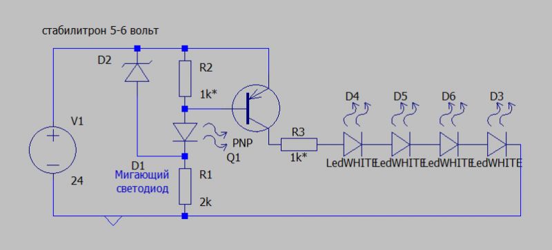 Правда, пришлось изменить номиналы резисторов и конденсаторов, чтобы сохранить частоту мигания- ~1 импульс в секунду. Диоды- наверное, проще всего что-то типа 1N400* (от 4001 до 4007) Конденсаторы- 100~220 мкФ, если нужно "ровно", то ёмкости одинаковые (по 150 мкФ), нужны разные длительности- ставите разные конденсаторы. Резисторы, вместо 47 кОм поставил 150 кОм.