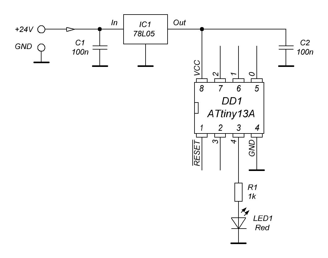 в этой же схеме цепочку из нескольких последовательно включенных led можно вставить между +24V и С1 (вход 78L05) а R1 ~300R - просто повесить на Vcc или Gnd.