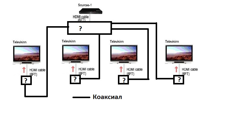Подскажите устройство(конвектор) преобразования HDMI сигнала для передачи его по коаксиалу и обратно в HDMI. Например как на картинки: Дело в том что имеется 4 телевизора в разных комнатах и спутниковый ресивер, проводка ( коаксиал ) уже протянута до всех, из одной комнаты где и должен стоят ресивер. Вот примерно так: Нужны примеры устройств под "?" Предложенный вариант очень извращённый, но по другому не как. Вариант тянуть HDMI - НЕТ Вариант беспроводной - возможно