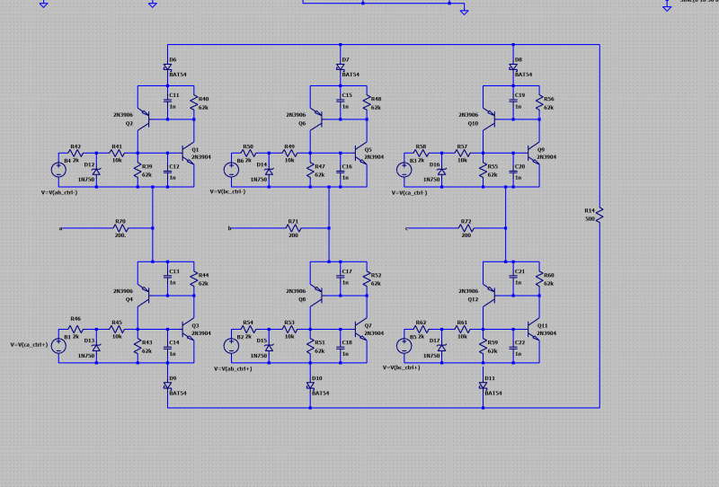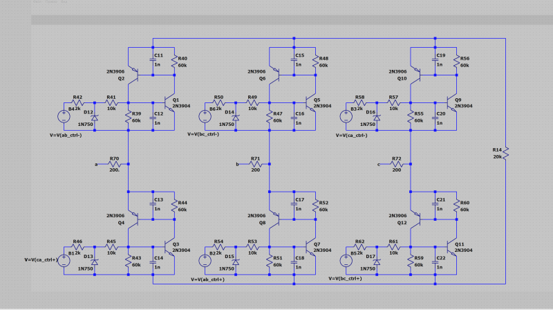 Здравствуйте, есть проблема (или это я туплю, тогда ткните носом) в моделировании 3ф управляемого выпрямителя, где в качестве тиристоров используется "тиристоросодержащий продукт" в виде известной схемы на двух транзисторах разной структуры. Суть в том, что если к каждому "тиристору" добавить последом диод как указано на скриншотах схемы, то она перестаёт работать, а по идее вроде как должна (или нет?), схема без диодов работает. Отсюда вопрос, будет такая схема выпрямителя с диодами работать в реале или нет. СИФУ выглядит криво, сильно не пинайте. Файлы проекта с диодами и без как и скрины прилагаю.