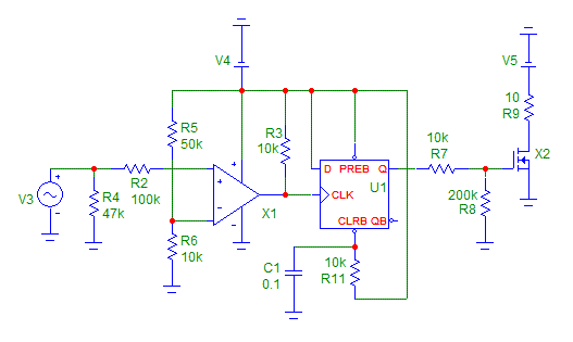 Вот и славненько. Осталось только нарисовать кнопочку выключения, которая будет сбрасывать триггер. Она наверно будет где-то между прямым входом ОУ и общим.