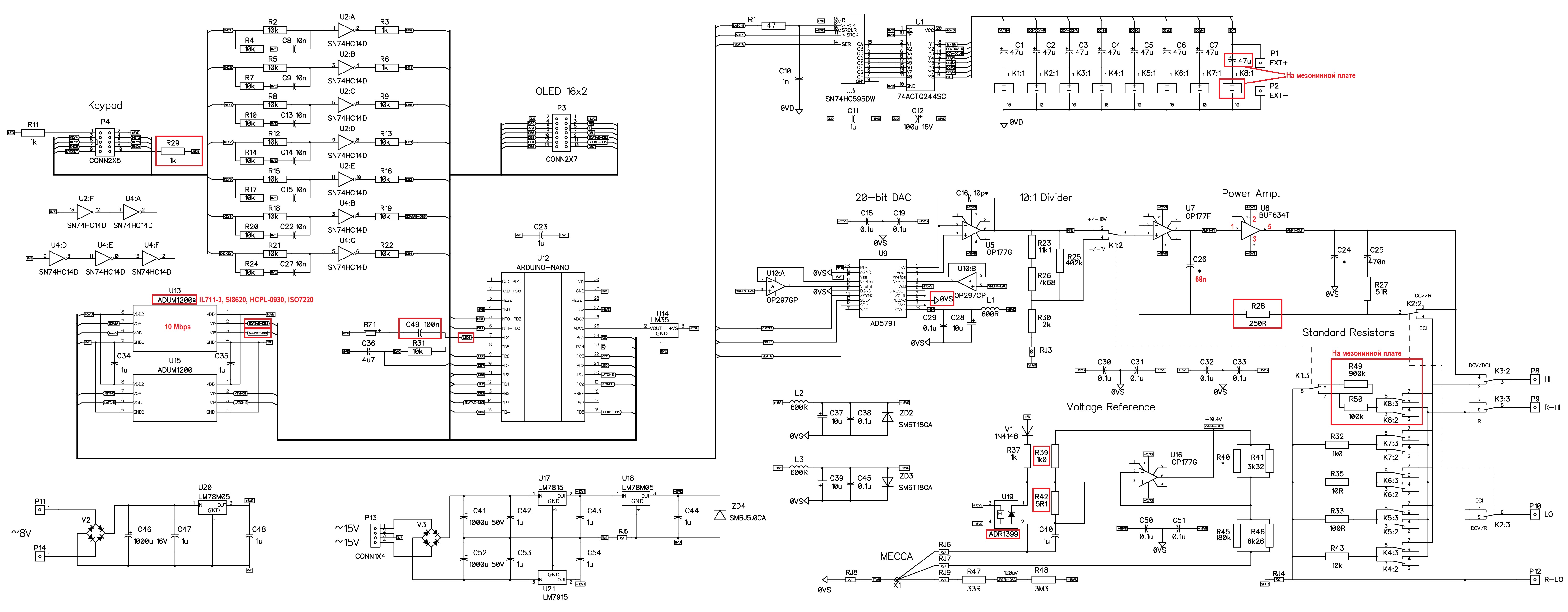 Поскольку принципиальных изменений в аппаратной части, в сравнении с опубликованной двумя страницами ранее версией, оказалось совсем немного, я не разводил новую печатную плату, а лишь немного доработал старую: перерезал три дорожки, бросил три проводка, заменил цифровой изолятор на более быстрый, добавил мезонинную плату с реле и 2-мя высокоомными прецизионными резисторами, поменял номиналы нескольких пассивных компонентов.