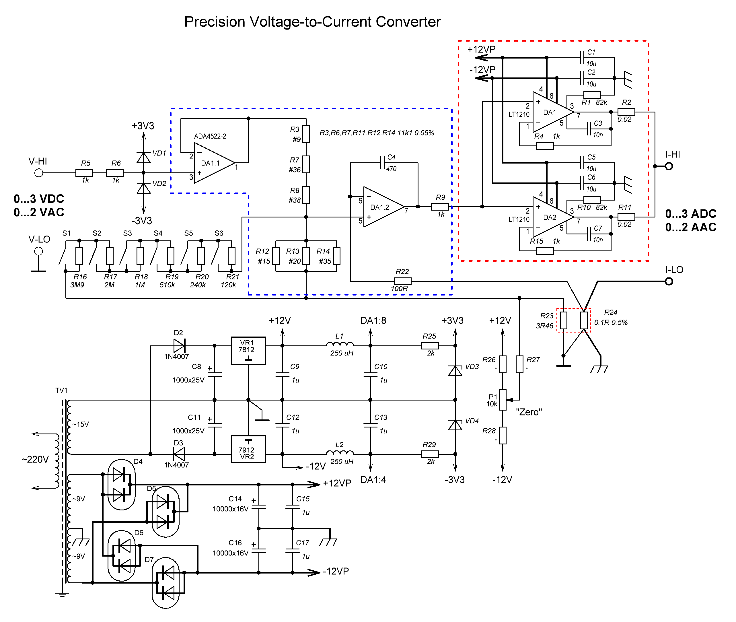 Для расширения диапазона силы постоянного и воспроизведения переменного тока был изготовлен простенький ИТУН на 3 А. Поскольку основная беда сильноточных ИТУНов - это саморазогрев шунта, проблемы сей не избежал и мой вариант. Для компенсации температурного дрейфа сопротивления шунта использован медный терморезистор.