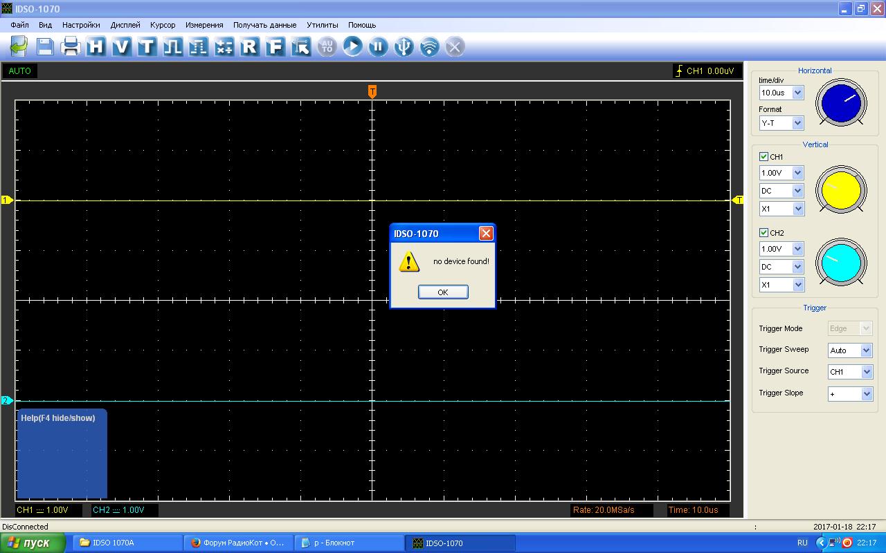 Получил я Hantek IDSO1070A 70 МГц WI-FI-USB Без упак.коробки в транспортировочной пленке в пакете. Комплектация соответствует как на фото на ихнем сайте.Аккумулятор внутри стоит и в софте показывает % разряда. Софт был скачен до покупки и установлен не зря сд диск который в комплекте не читается на двух ноутбуках. После нажатия кн.ВКЛ\ВЫКЛ загорелся индикатор и через секунд 5 индикатор WI-FI.Состыковка прошла успешно.Код wi-fi написан сзади ослика на этикетке (1234567890)Софт на китайском(одни квадратики)и по умолчанию англ.Пока я его ждал русифицировал меню(спасибо интернету)Пока всё. Скрины вид софта мануал на англ. Что то не получается добавить IDSO1070A Software 18,9 МБ rar