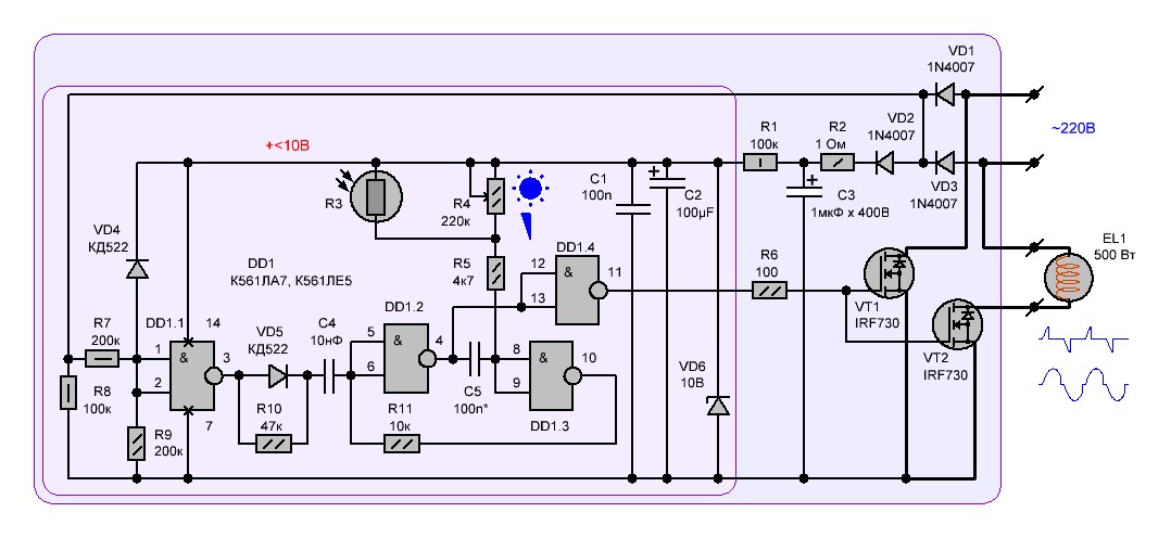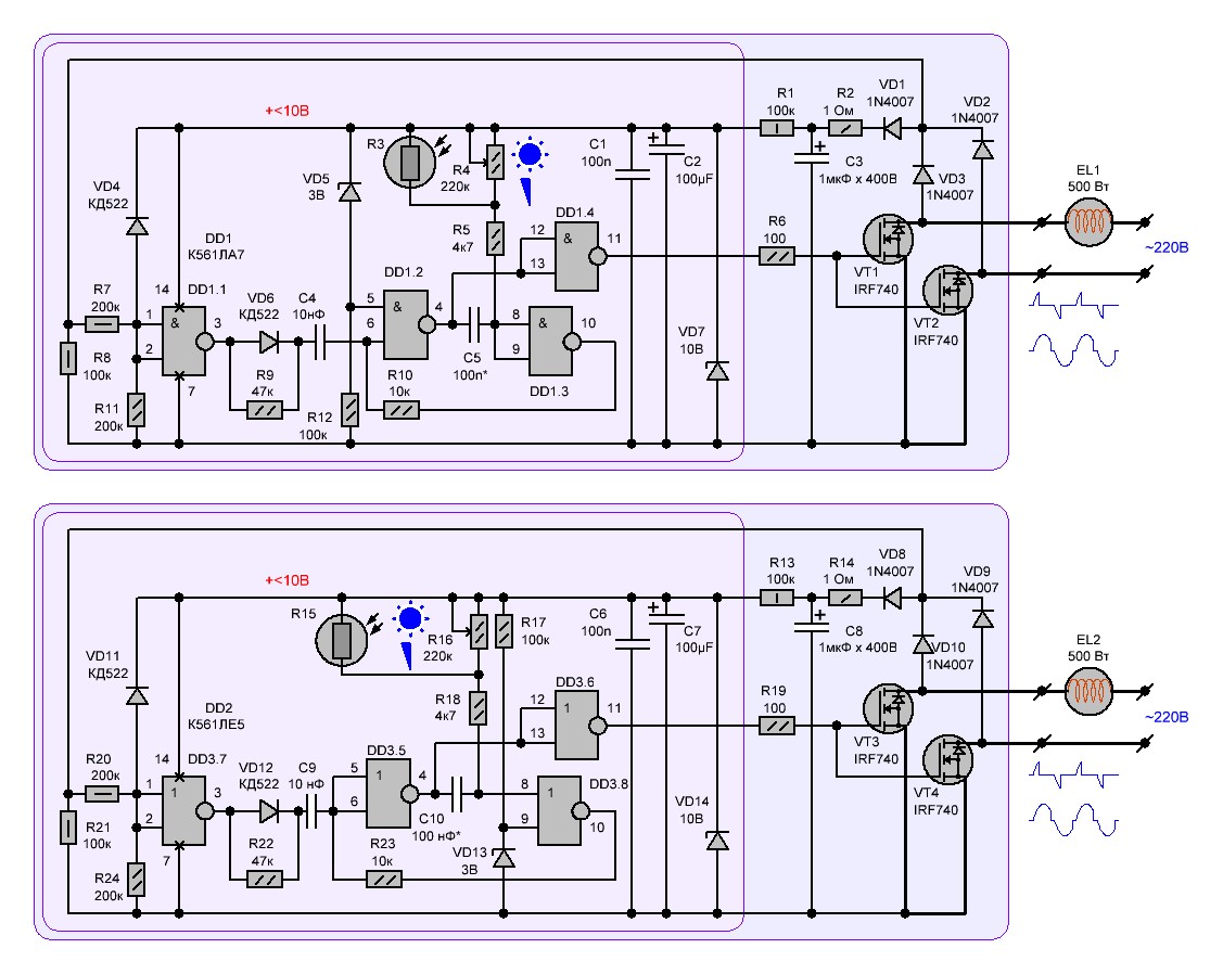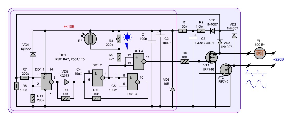 Так как у меня все испытательные платы такого регулятора, собраны на К561ЛЕ5, то поставить стабилитрон с резистором на второй элемент DD1.2, не получится. Под рукой просто были ЛЕ5, ЛА7 искать надо по коробкам, и теперь на какой-то плате перепаивать.