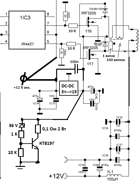 lalafau Спасибо еще раз. DC-DC довольно мощный - до 5 А выходного тока. Название XL4015. По даташиту реально сможет отдать 4 А при 36 В на входе и 12 В на выходе с КПД 90%. Думаю справится. Резистор на 1К уменьшу, скажем до 500 Ом. Думаю норм будет. На всякий проверю. Резистор 0,1 Ом 2 Вт используется всего лишь для более "мягкого" ограничения и чтобы транзистору было чуток полегче работать. Можно бы было и совсем без него. Диоды поставлю HER507 - думаю их за глаза хватит. Емкость 1C42 увеличу. 1R24 и 1R25 сдвину к полевикам. Также отмечу, что я добавил на схеме кондер на 100 нФ между входом и выходом DC-DC. Чтобы оставшиеся не сглаженные электролитом импульсы вернулись в аккумулятор. Верно мыслю или он вообще не нужен? Также намотал пробный транс на Ш-феррите. Первичка 2+2 витка шиной 0,6 мм. Вторичка 22 витка 5 шт. * 0,56 мм. Обкатал это дело с двумя ферритами. У одного из них ток х.х. (БЕЗ ОС) 0,5 А (меньшая магн. прониц.), у второго 0,65 А (большая магн. прониц.). В целом неплохо. Ток х.х. с ОС - у обоих 0,11 А. На порядок лучше, чем у начальных трансов. Проверял все это на плохих полевиках с высоким внутр. сопротивлением. Нагрузка 300 Вт тянется без проблем, но КПД 68%. Транзисторы однозначно под замену и плату заново сделаю и переразведу. Пока что вопрос по трансу. Судя по току х.х. 2+2 витка в первичке достаточно? Или лучше 3+3 сделать?