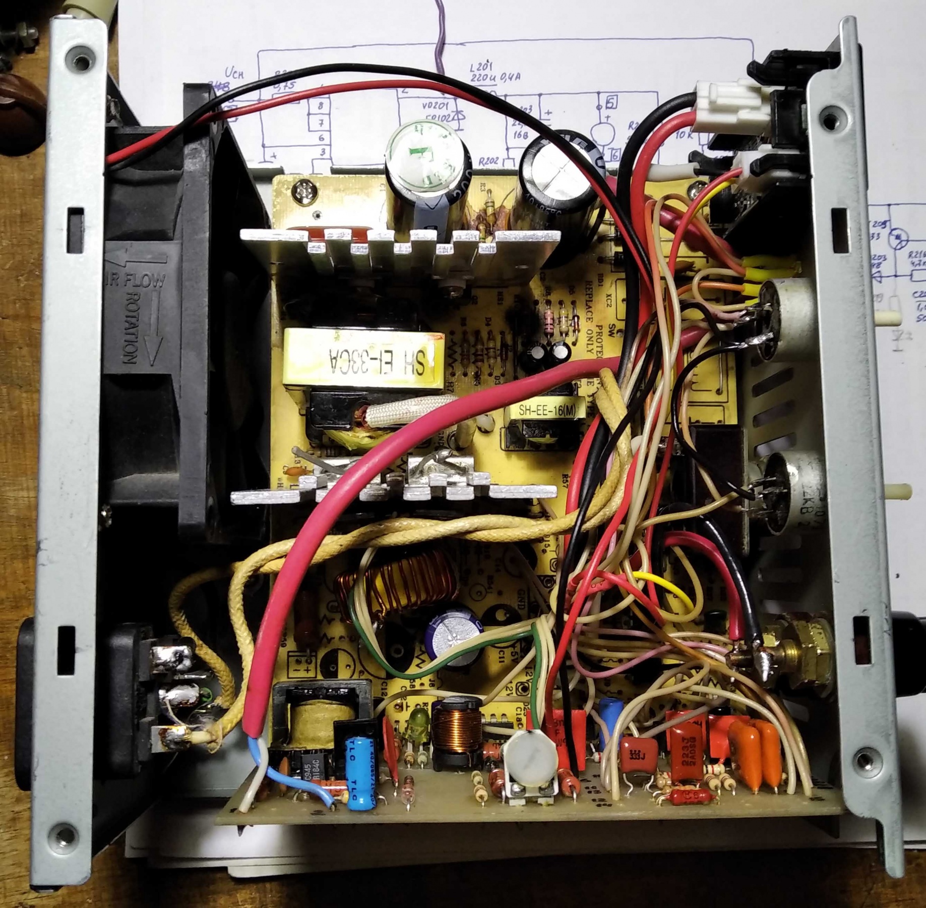 Наконец закончил свой первый лабораторник из AT блока питания. (ну и всякие монтажные и оформительские дела). Публикую что получилось. Параметры 20В 10А. Транс не перематывался. Выпрямитель со средней точкой. Схема содержит регуляторы напряжения и тока, которые почти без изменения срисованы у Shpionus. В схему встроен китайский показометр (вольтметр-амперметр), шунт которого перенесен на основную плату и напряжение с него заведено в регулятор тока. Датчик тока находится не в петле обратной связи по напряжению, потому выходное напряжение будет падать на величину падения на шунте (50мВ). Сделано для упрощения и чтобы не городить еще один шунт. Вторичный выпрямитель собран на двух "китайский сборках" из диодов FR302, которые стояли в каналах 12В. Дополнительно введены: триггер токовой защиты (также перерисован у Shpionus), регулятор скорости вентилятора (датчиком температуры является транзивтор VT202, который прижат к радиатору вторичного выпрямителя) и триггер тепловой защиты, который глушит преобразователь, если напряжение на вентиляторе вырастет выше 13В. Конструктивно часть деталей стоит на родной плате, часть на дополнительной: дежурка, регулятор скорости вентилятора, триггеры защиты, обвязка регуляторов. Также, через доп плату подключены органы передней панели.