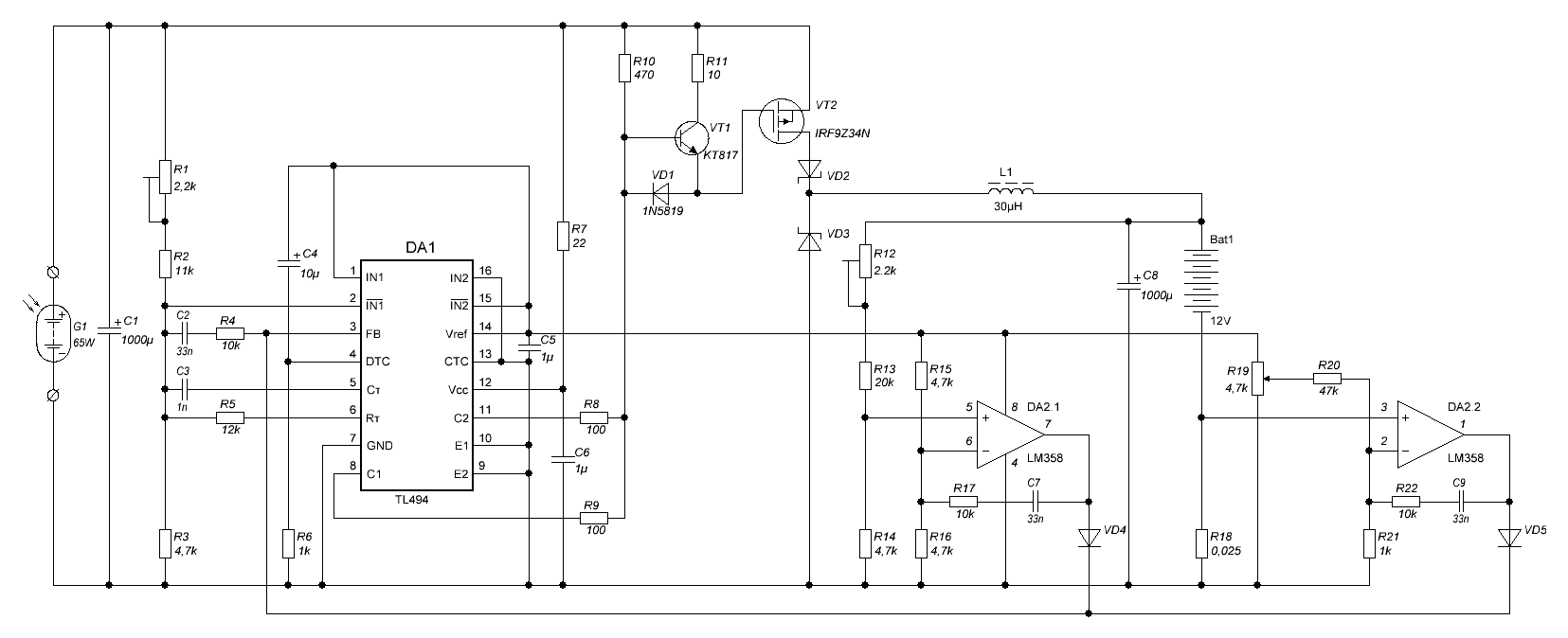 Что то мы отвлеклись от темы, к сожалению никак не могу вложить фото , связь очень слабая , собрал обыкновенный DC\DC преобразователь на TL494 с стабилизацией вых. напряжения на 14 вольт. Обратная связь по напряжению взята с выхода и через резистор 8,2 кОм подведена к усилителю ошибки , последовательно подключен переменный резюк 470 Ом который позволяет регулировать напругу от 14 до 15 вольт. Транс собран на сердечнике от строчного фирменного телека и намотан гибким изолированным проводом сечением примерно 2,5-3 квадрата количество витков в обоих обмотках одинаковое и равно 7+7 с отводами от середины . первичка коммутируется 4-мя IRFZ44 по два на плечо ,вторичка - отвод от середины на корпусе, с других концов два диода шоттки на общий плюс выхода. Схема после долгих настроек и подгонок количества витков транса заработала хорошо, только при превышении тока выше 5-ти ампер слышен слабый свист, проверял подачей на вход напруги 18-19 вольт от двух аккумов 12 и 6 вольт, выход 14 вольт держит хорошо. И самое главное ,ток ХХ меньше 50-ти миллиампер,сам удивился. Сегодня целый день было солнце и СБ на аккумы выдавало 10-12 ампер в полдень напрямую. Подключил через преобразователь , ток наоборот снизился до 5-6 ампер,, провода от преобразователя до аккума начали сказываться(сегодня не удалось устранить) ,меряю на входе контролера напругу -около 17 вольт, думаю почему же так, ведь точка максимального отбора , лезу на крышу - напруга прямо у СБ 18-19 вольт, тут уже сказалось сопротивление проводов снижения . К сожалению померить КПД не получилось по ряду этих и других причин