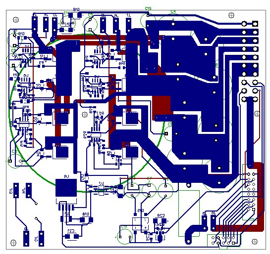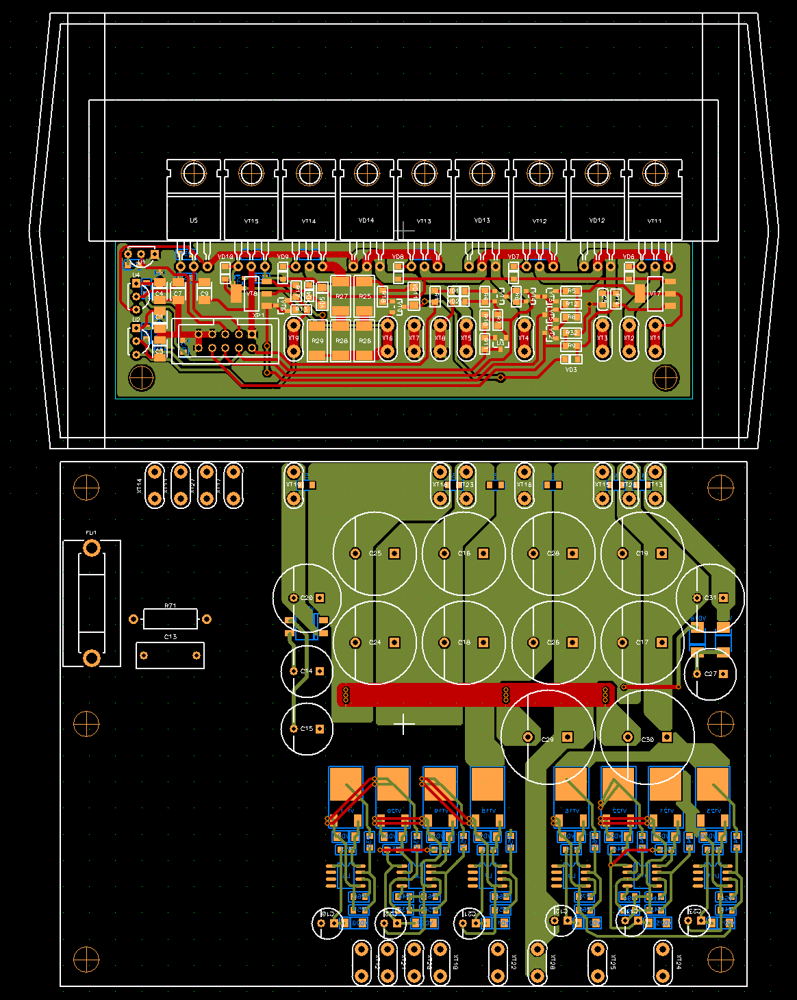 Красиво и компактно! А диаметр трансформатора какой? Неделю уже развожу, конденсаторы не получается красиво выровнять. Хотел стабилизаторы 5В на плате выпрямителей развести, соответственно плата усилителей ошибки и ФНЧ втыкается субмодулем также на плату выпрямителей. Платы управления и выходного каскада также подключены к плате выпрямителя. Получается, что плата выпрямителя становится основной платой для всей конструкции. Сейчас уже сомневаюсь в рациональности такого решения, но еще попробую немного повозится с компоновкой, может найду более подходящий силовой разьем для платы выходного каскада. 20ти контактный разьем питания материнской платы слишком уж избыточен, даже с запаралеливанием сильноточных цепей. Прицепил черновик.