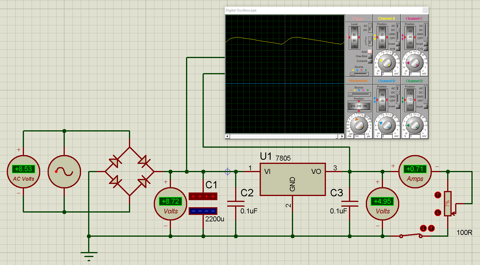Вот "попытка моделирования"- "исходные данные"- напряжение вторичной обмотки трансформатора- ~9 вольт, на конденсаторе после диодного моста- 10,5 вольт без нагрузки. при остальные параметры несущественны Конденсатор 470 мкФ: Спойлер
