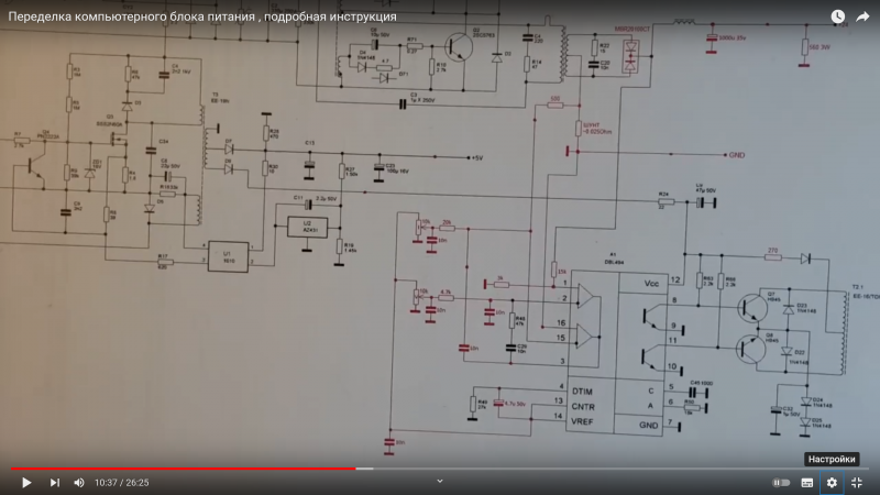 Занимаюсь переделкой ATX блока питания в регулируемый, это мой первый блок. Название блока Power Master FA-5-1, схему прилагаю. Руководствуюсь вот этим видео: https://www.youtube.com/watch?v=mE4sjdHJeQ0 . Дошел до момента установки регулятора напряжения (фрагмент в ролике на 17:06) и у меня так же как и там получается, что максимальное напряжение выставляется уже на половине поворота регулируемого резистора, а оставшаяся половина работает в пустую. Автор советует найти два резистора идущих с первой ноги TL494 на землю и на 12В линии и заменить их на 4.7 кОм и 15-17 кОм соответственно. Я заменил на 4.7 и на 16 кОм, но ничего не изменилось (добавился лишний писк, которого не было со родными резисторами. Так вот, вопросы: 1) Как сделать так, чтобы напряжение регулировалось не до половины переменного резистора, а до конца? 2) Далее хочу сделать ограничение по максимальному напряжению около 20 Вольт вместо возможных 25 Вольт, как можно ограничить максимальное напряжение? 3) Аналогично хочу сделать ограничение максимального тока, чтобы было не более 8 Ампер, как можно будет это сделать?