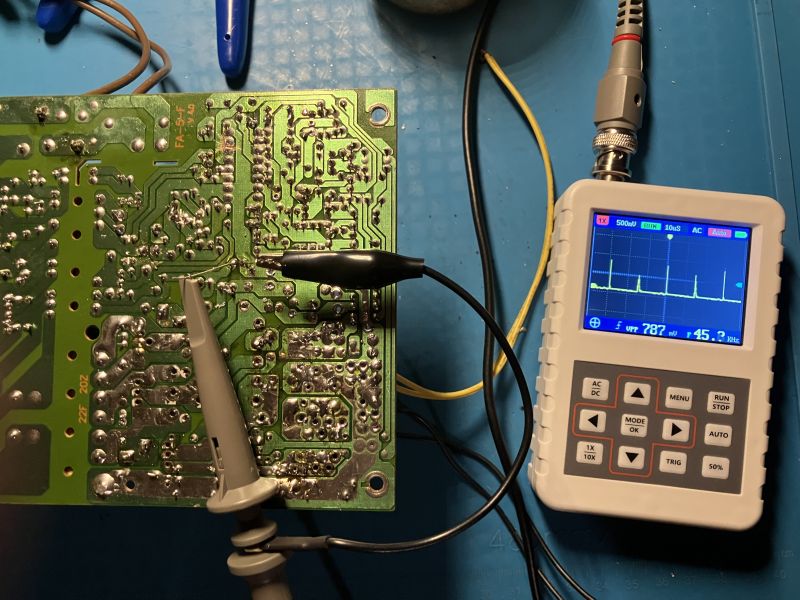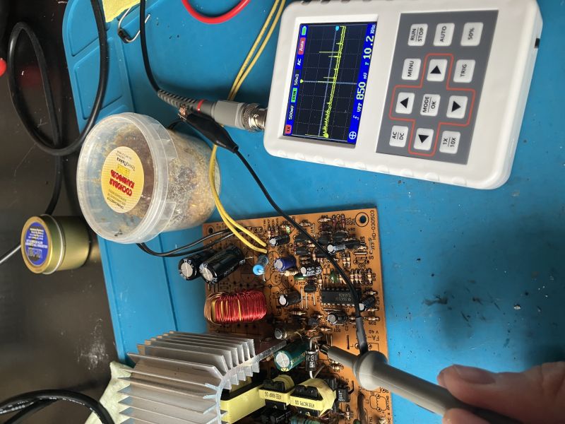 Пока что был сделан шаг назад - снял регулируемый резистор по напряжению. Дело в том, что обнаружились проблемы с дежуркой - звенит керамика С7 (10nF 1кV) в снабберной цепи и на 12 ногу ШИМ с малого диода приходят пульсации около 800мВ (напряжения на большом диоде 5В, на малом диоде 23В). Керамику С7 проверил на транзистор-тестере (вероятно, следует всё же проверить заменой, ведь может быть микротрещина?) - выглядит хорошей. Были проверены заменой оба диода, заменены все электролиты 1uF 50V в горячей части (особого криминала не было, ESR был немного завышен), был заменен конденсатор С11 по выходу дежурки. Пока без изменений, разве что звон стал более ровным.