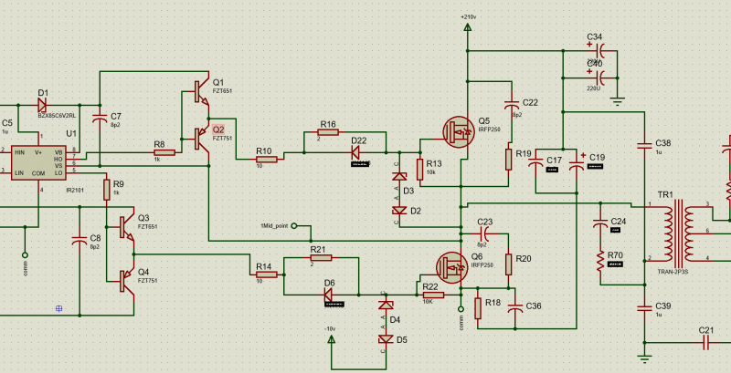 Странная схема, откуда взялись 210в если питание 220в, там должно быть более 300в. И транзисторы эти не пойдут, при питании 220в, тем более сейчас по стандарту в сети 230в. Зачем там эмиттерные повторители? достаточно поставить более мощный драйвер, номиналы странные. И почему вдруг транзисторы откроются одновременно, это должно быть исключено схемой управления. Ну это меня не касается, хотите отрицательное напряжения запирания, вот. но питание драйвера нужно увеличить до 15-16-17в.