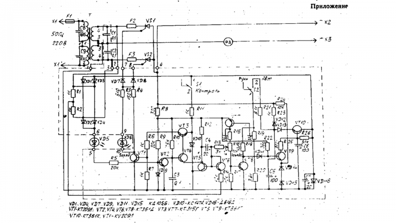 Симптомы: -при подключении АКБ нет индикации "Заряд" , нет тока на выходе. - При касании базы VT3 начинается заряд с током до 0,7А, выше выставить не удается, индикатор "Заряд" - светится. Что сделал: - Нашел заводскую схему, которая не многим лучше того, что в сети... https://img.radiokot.ru/files/154799/me ... 9pzjsq.png - схема - По классике, поменял почти все электролиты, а те, что не поменял, на ESR тестере более чем пригодные по емкости, утечке и сопротивлению. Номиналы ставил заводские, игнорируя номиналы на схеме. - выпаял и проверил отдельно каждый транзистор и диод, включая стабилитроны... - в последствии экспериментов и казусов, выпаял и поменял абсолютно все КТ315И, и КТ361Г (которые с завода шли все Г, а не Д), менял КТ209Л на К. - поменял Ку202Г на КУ202Н, управляющее то же, только рабочее выше. - проверил контакты построечников R15,19 и регулировочного R16 резисторов. - поменял стабилитрон на 22В. (Д816А) - походу понял, что электроника сгорела к чертям, пока писал этот текст, т.к как VT1 по базе и эмиттеру имеет 20,5В, которые летят на управляющие электроды тиристоров с напряжением открытия 5-7В.... , на стабилитроне КС147А вместо 4,7В теперь те же 20, а на анод-катоде тиристоров напряжение аккумулятора, которое очень быстро высаживается... - заменил ПСО 0.1мкФ 160В на пленку 0,1мкФ 250В, потому как на одном из форумов вычитал, что они могли влиять на напряжение с транса, человек их поменял и проблема ушла. Самое противное, еще и плата нето на гетинаксе, не то на плохом текстолите, при паяльнике в 250-270 градусов проводники отлетают только в путь, а на плате ни одного обозначения, даже полярности электролитов...