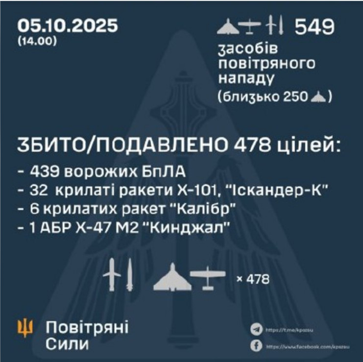 "По Украине ночью было запущено 416 воздушных целей, было 96 прилетов, сообщают Воздушные силы ВСУ. Из 381 БПЛА (Шахеды и другие) сбить удалось 303. Из 35 ракет (в том числе сразу 28 «Искандеров») удалось сбить 17 (в том числе 12 «Искандеров»). Были прилеты 18 ракет и 78 дронов на 15 локациях. Основное направление удара – объекты энергетики в Харьковской и Полтавской областях. Также пострадали Сумская, Днепропетровская, Одесская и Киевская области".