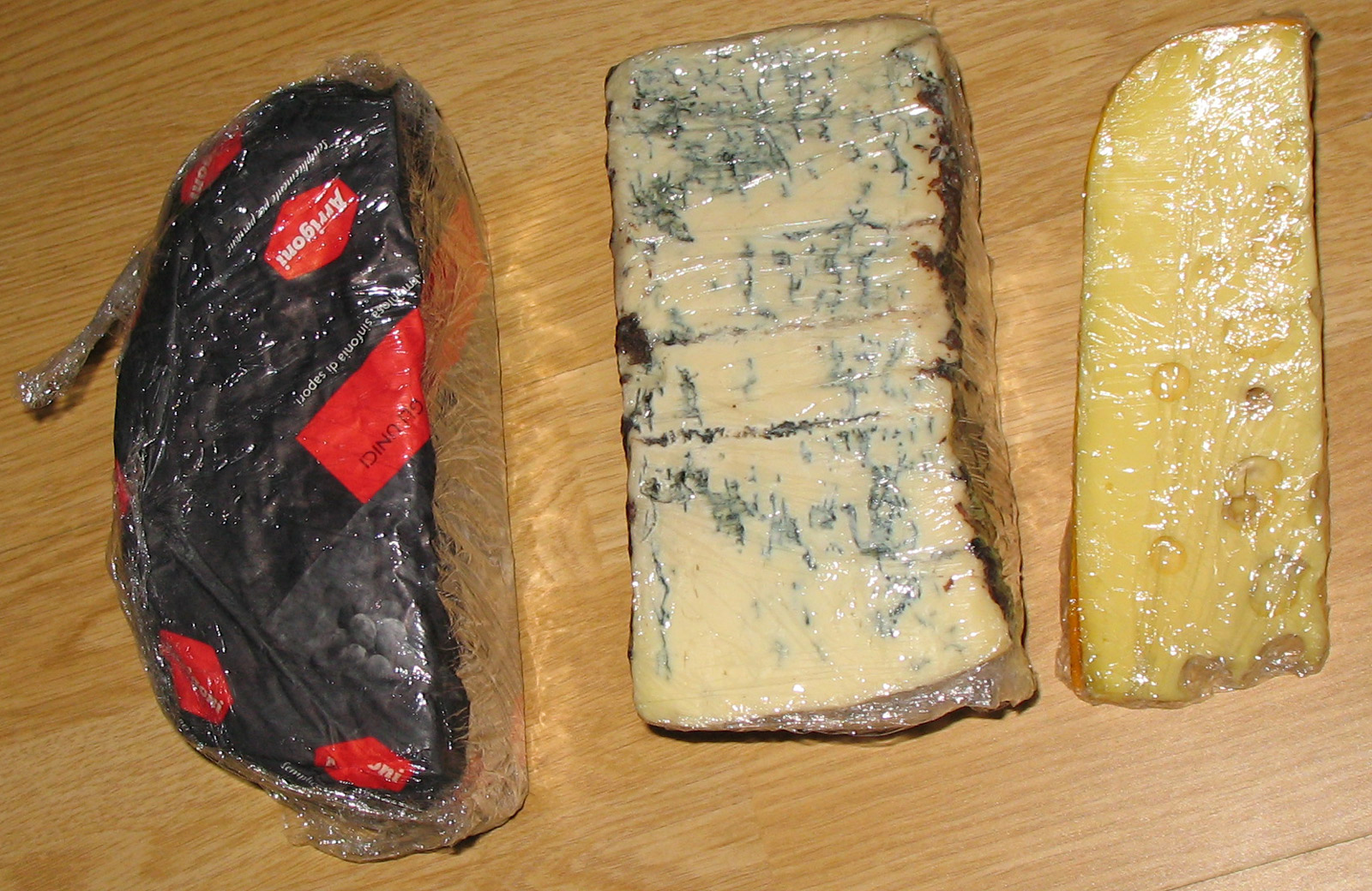 Вот такие 3 кусмана нашел. На ресторанной помойке. Самый правый - чедар, посередине х.з. - похож на дорблю или рокфор, но нежнее и с боков какими-то хрустящими коричневыми семенами посыпан. Левый пока х.з. - не открывал еще. Эти дохавать пока надо. А там много - каждый больше кило весит, только на фотке как-то маленькими кажуца.