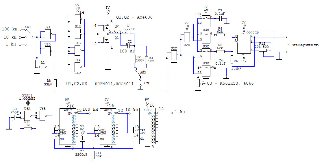 схема имеет свои особенности из-за меандра, наблюдаются отличия в показаниях по сравнению с приборами на синусоиде, но для такого класса самоделок... Как говорится - "на безрыбье и рак рыба",