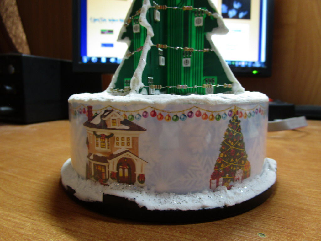 Особо мудрить не стал, 5 линий с RGB светодиодами (итого 15 каналов BAM), 30 эффектов, которые меняются самостоятельно, без всяких кнопок. Основание из банки от компакт-дисков, снег (больше похожий на глазурь на торте ) из соды и клея ПВА и чуть блесток. Питание от USB. Разумеется, на фотографиях эффекты не передать, но представление составить можно.
